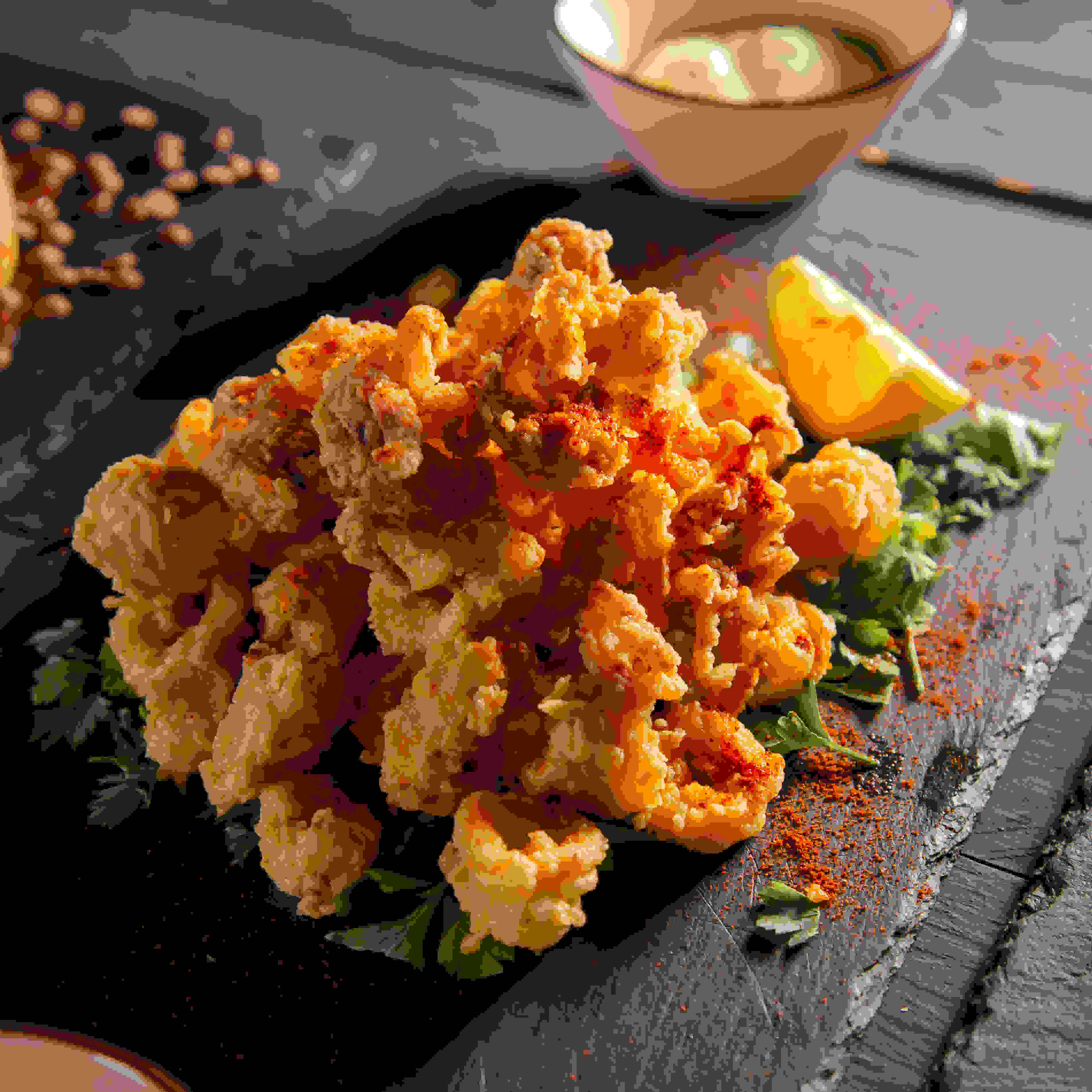 كاليماري طازج متبل بالزنجبيل (200 جرام) وزيت الزيتون الفلفل الحار ، مقلية إلى ذهبية تقدم مع صلصة الليمون بالليمون وصلصة الحامض الحارة * البنود هي حار