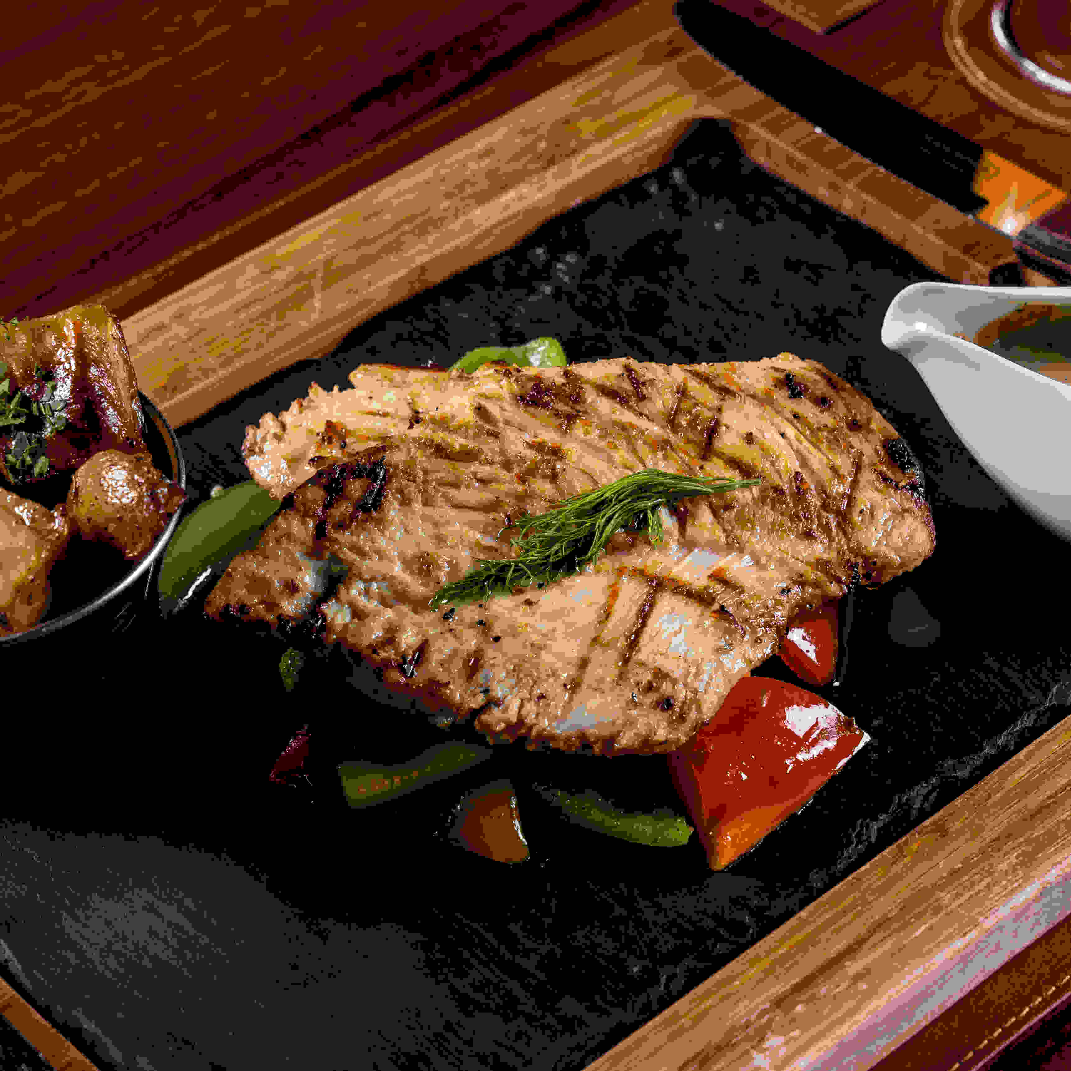 Indulge your steak with one of our homemade sauces (creamy mushroom, mixed peppercorn, bleu cheese, bbq relish, and creamy garlic) served with your choice of mashed potato, french fries, roasted herb potato, roasted vegetables, sauteed mushroom