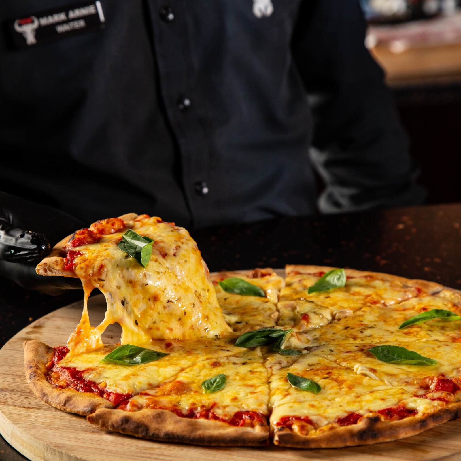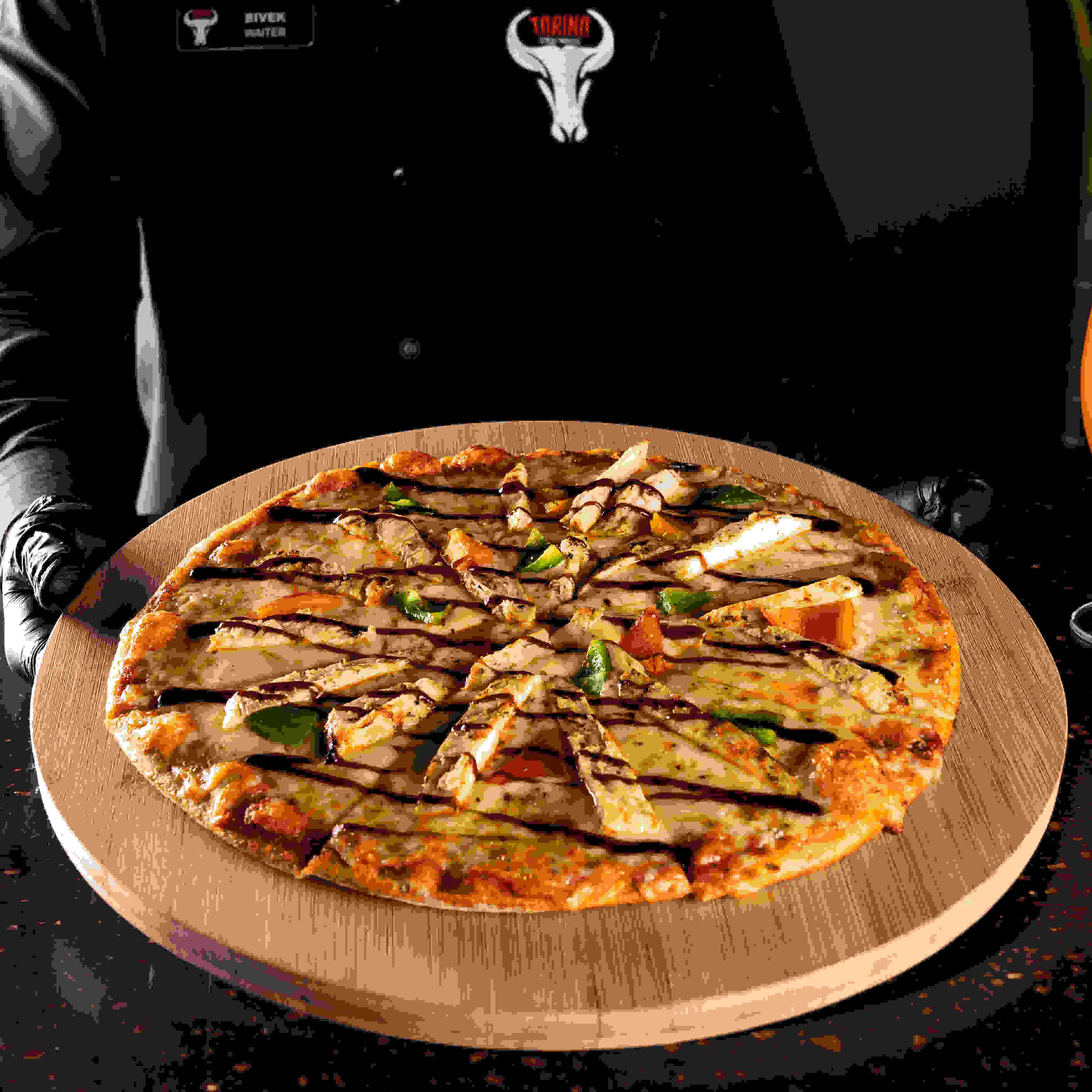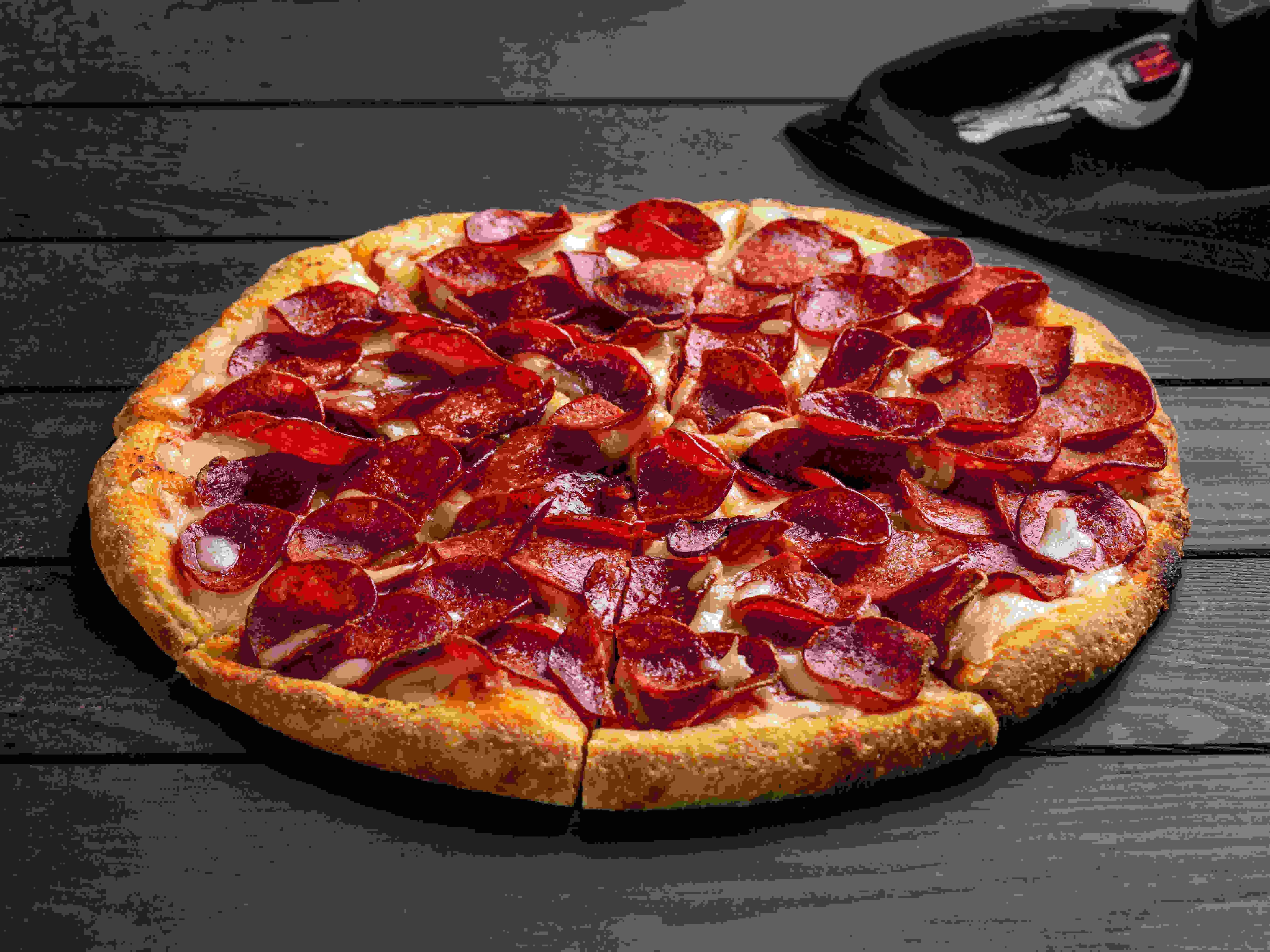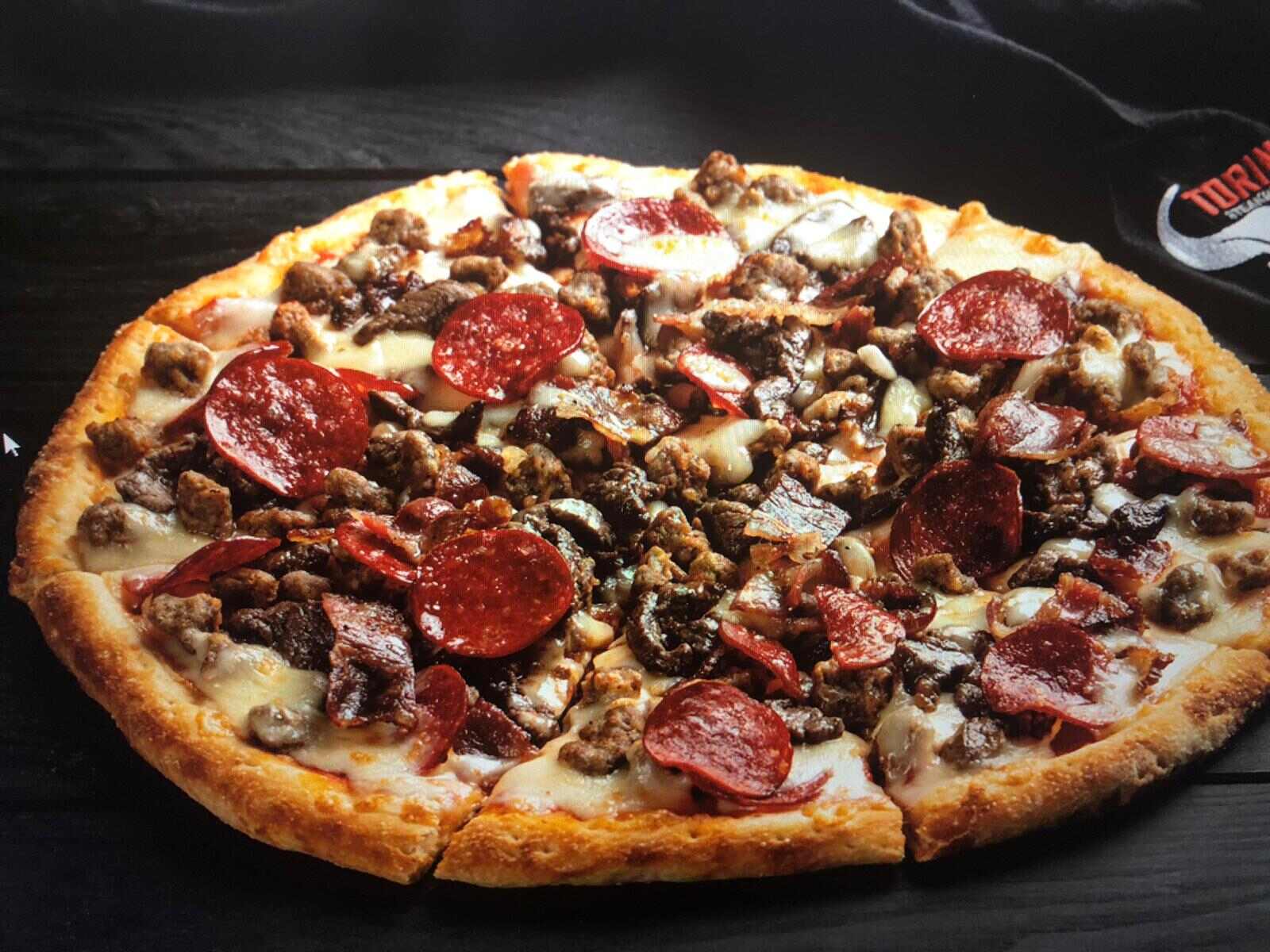 عجينة سميكة محضرة منزليًا ، مغطاة بصلصة بيتزا حمراء ، موزاريلا محمصة ، شريحة لحم أنجوس بقري أمريكي معتمدة ، طبقة رقيقة من لحم بقري ، قطع لحم مقدد و بيبروني