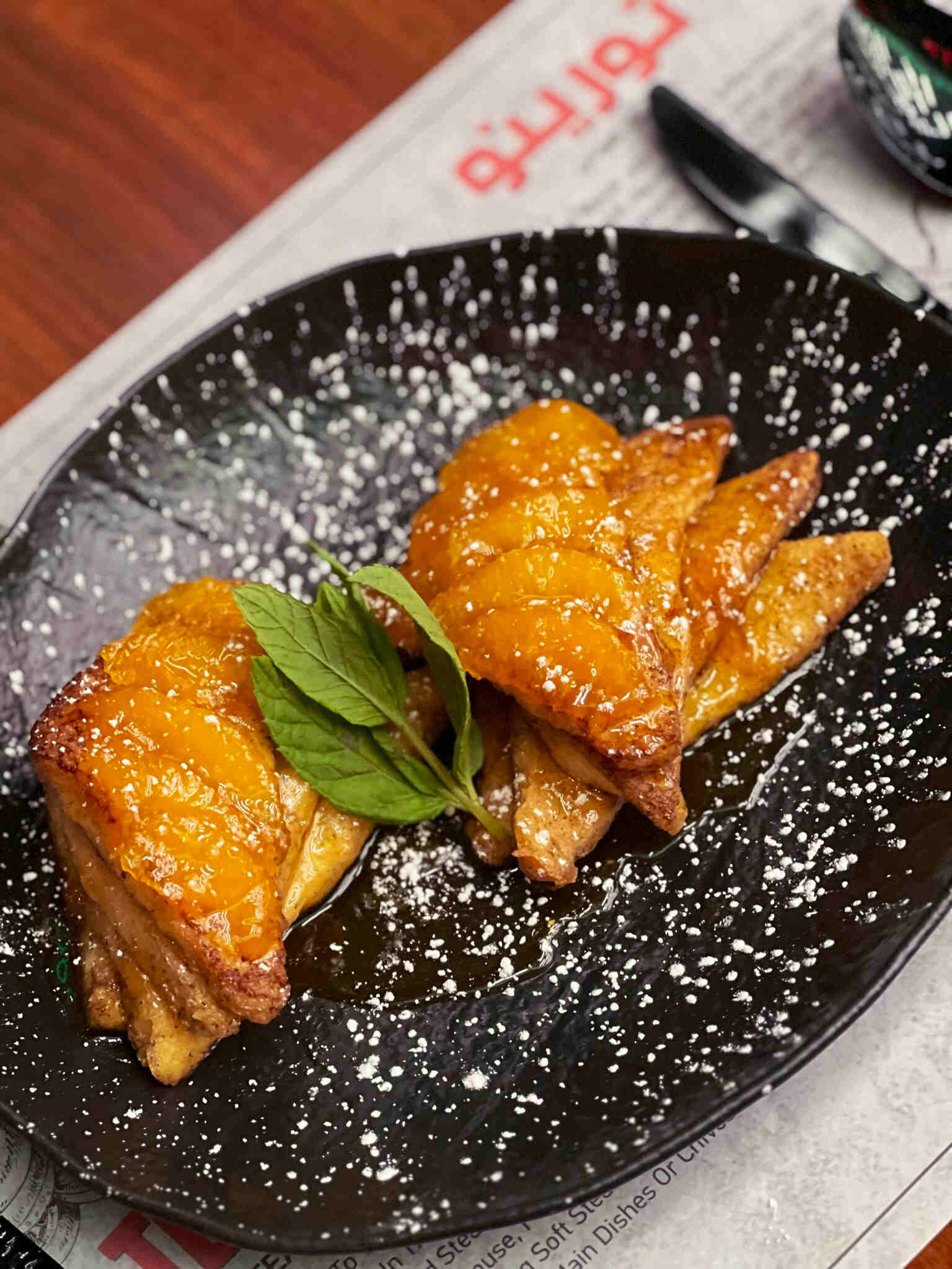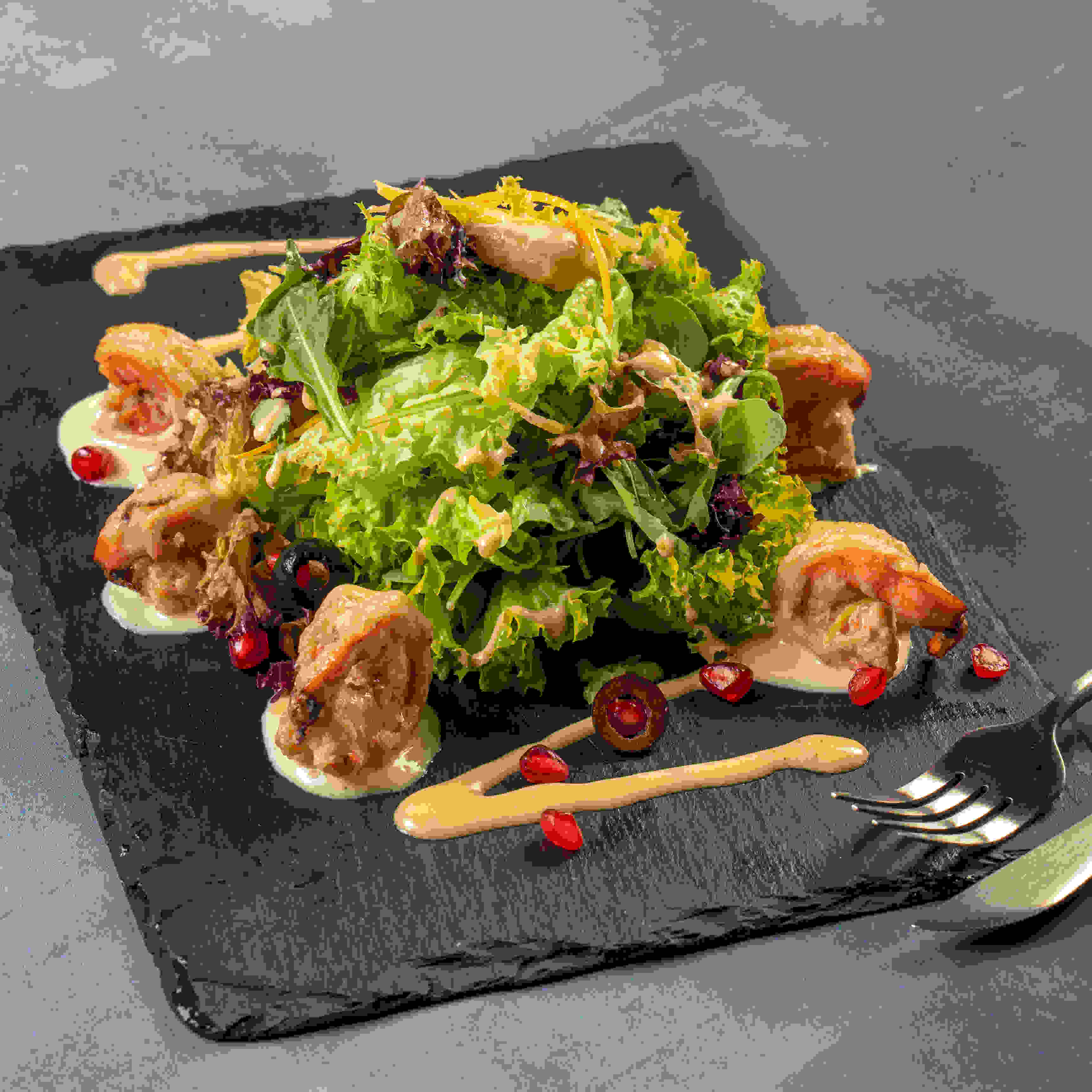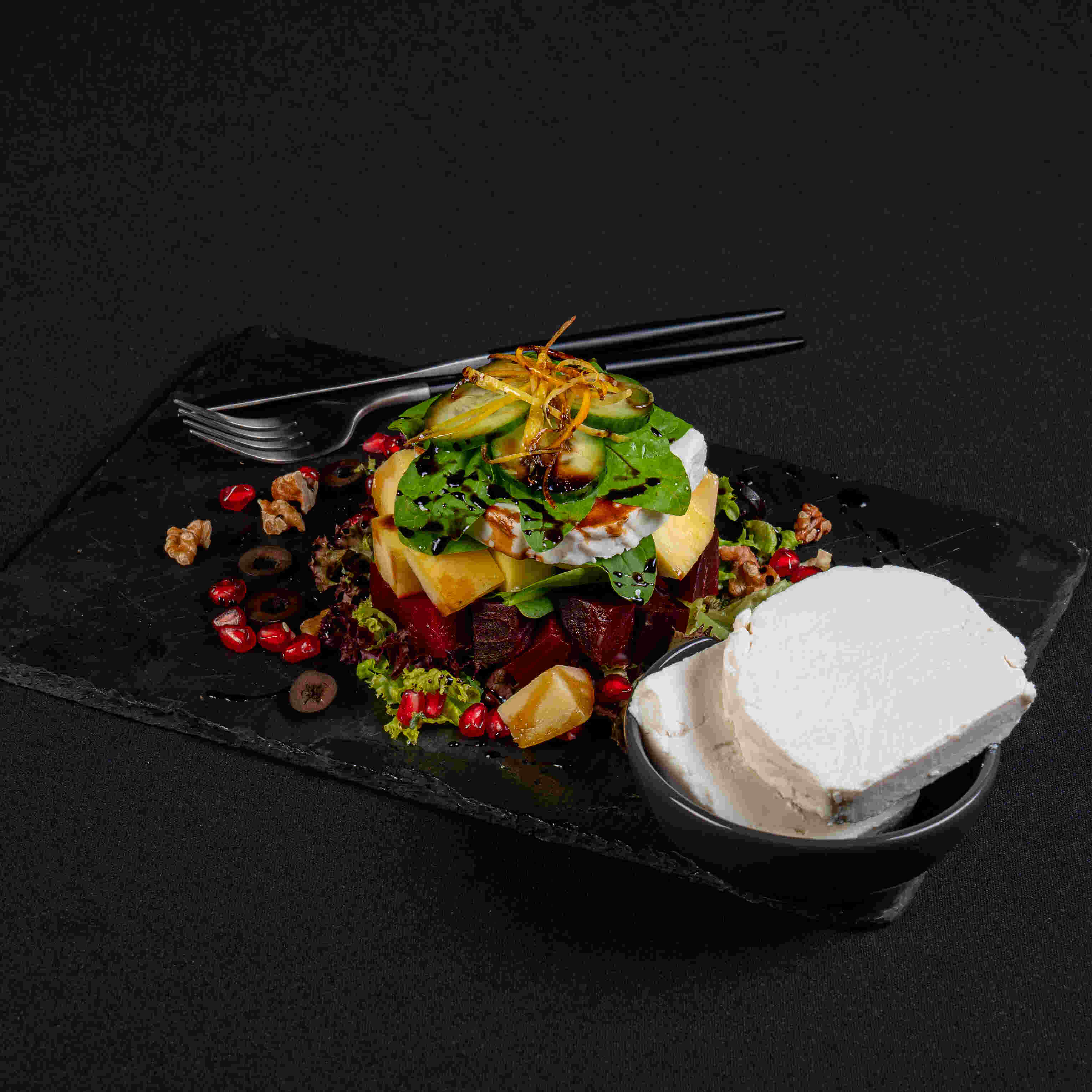 أوراق موسمية مختلطة من السبانخ ، مانجو طازج وشمندر متبل بتوابل وأعشاب خاصة بزيت الزيتون مغطاة بالجوز المشوي وتقدم مع صلصة الخل والخل البلسم * يحتوي على المكسرات
