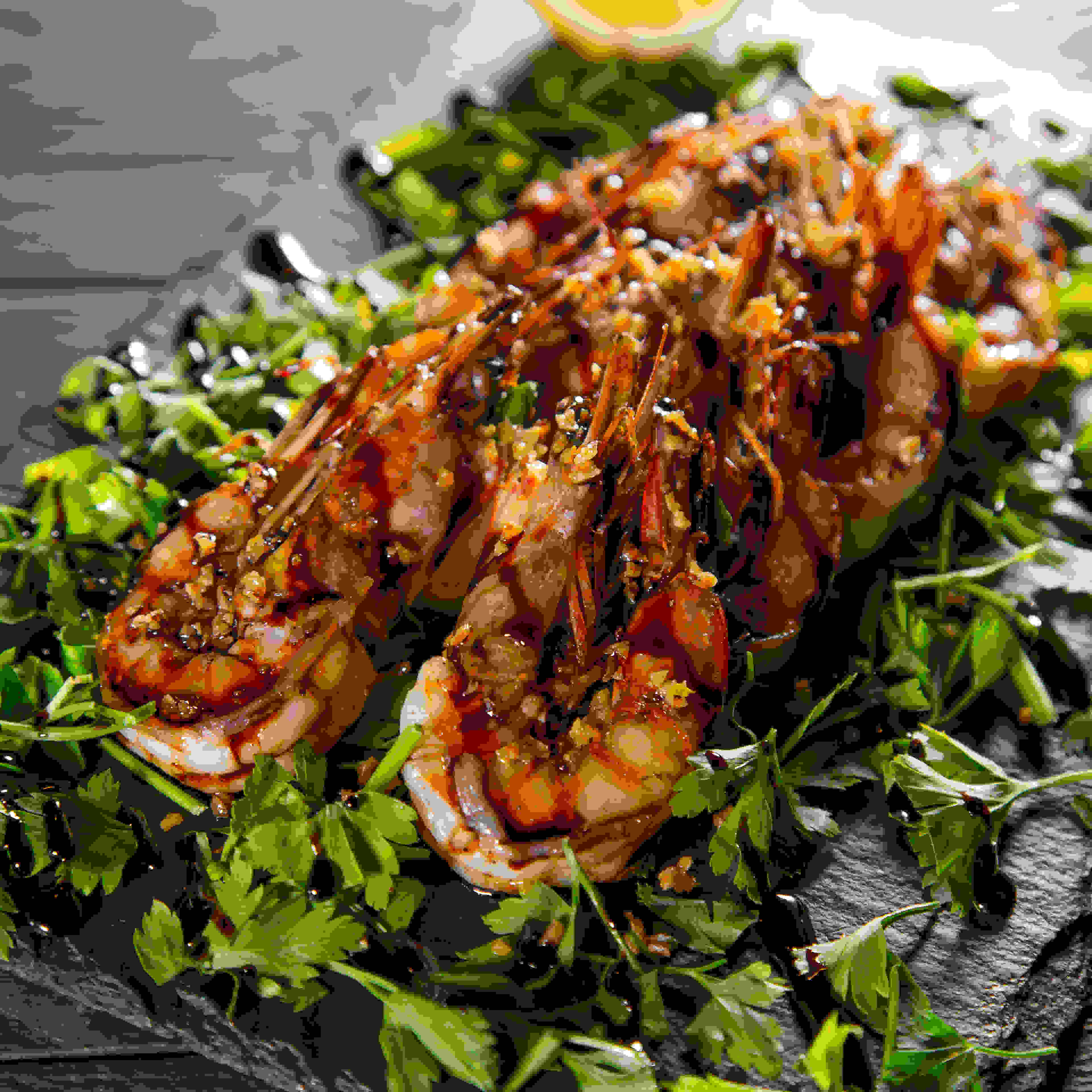 روبيان جامبو طازج مطبوخ بزيت الزيتون البكر (200 جرام) و ثوم مشوي مغطى بلمسة من صلصة البلسميك