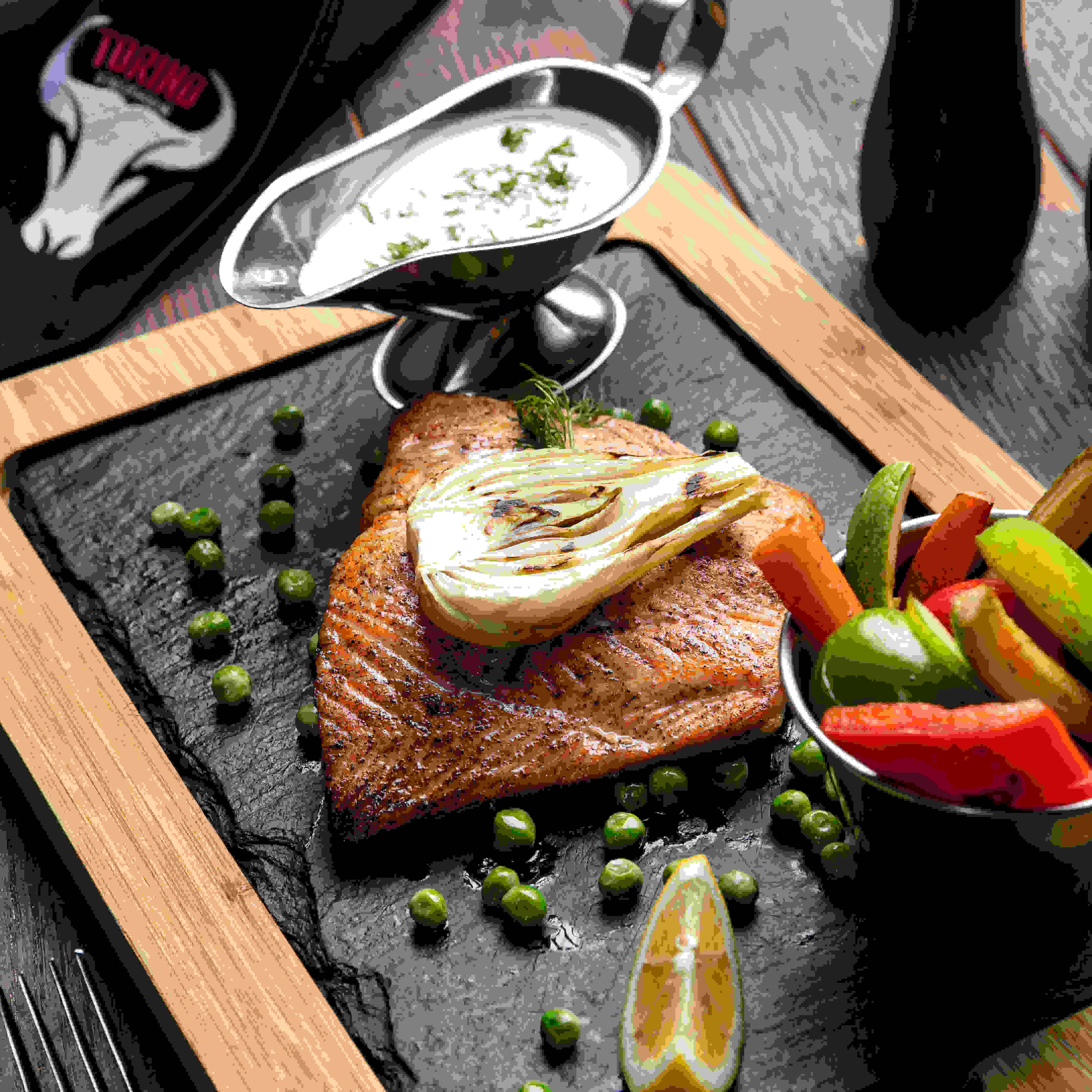 سمك السلمون الطازج(٣٥٠غرام) المشوي يقدم مع الخضروات ٩٨ ق ر