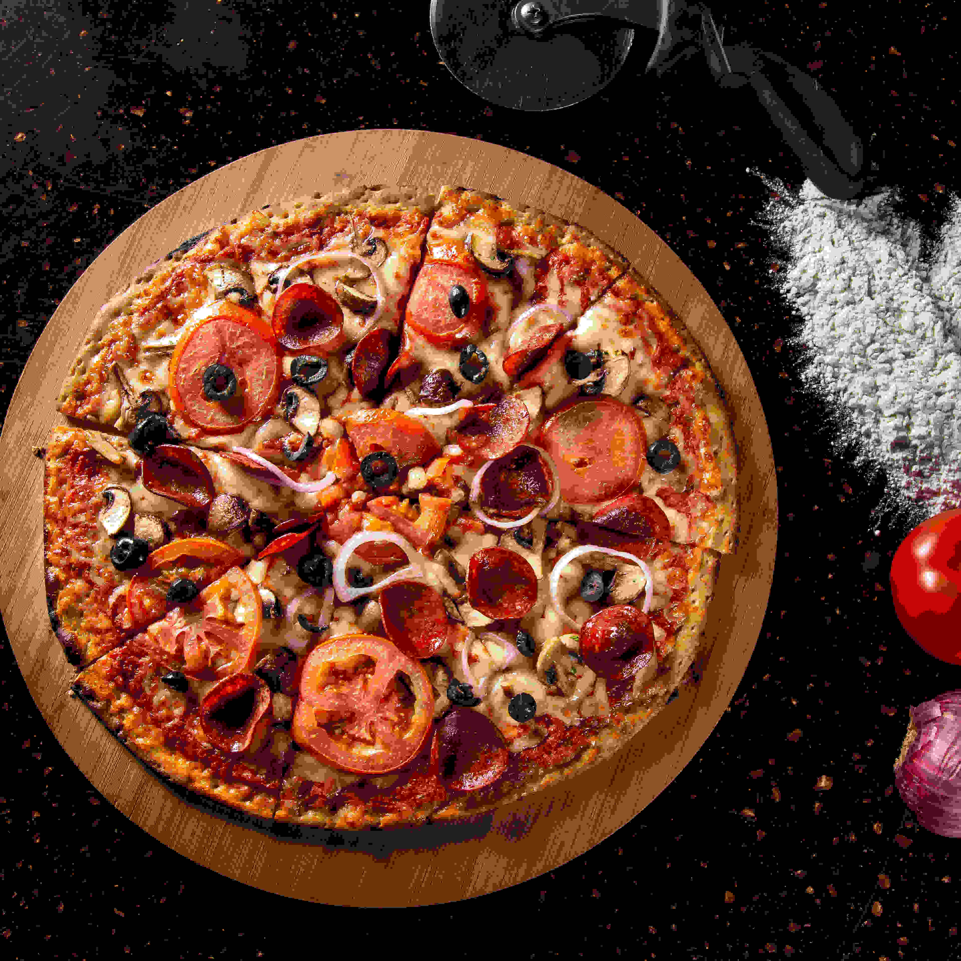 صوص الطماطم مع جبنة الموتزاريلا ولحم البيبروني والمشروم وشرائح البصل وزيتون الكلاماتا والجرجير ٤٨ ق ر