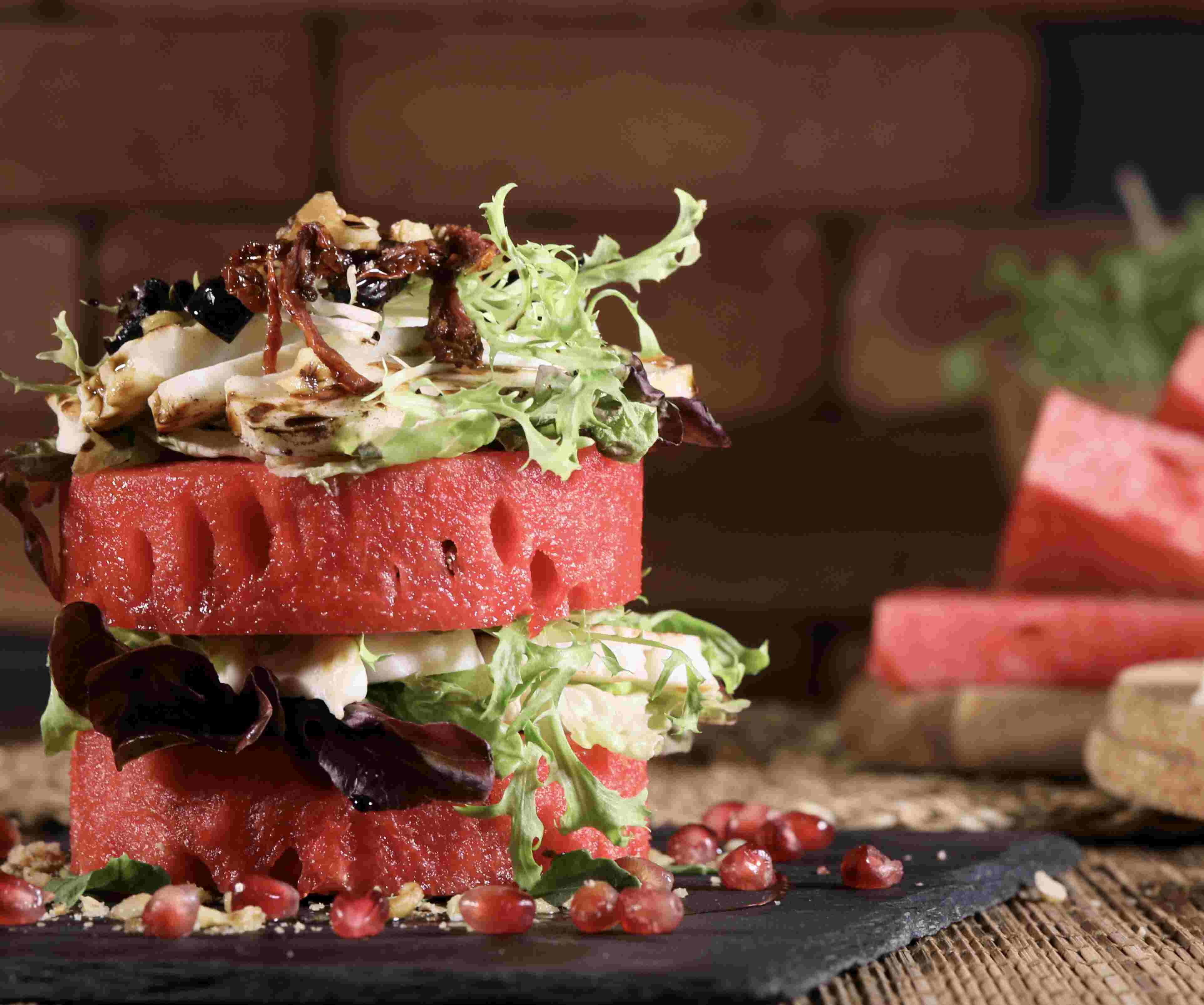 جبنة حلوم مشوية مع بطيخ متبل مخلوط بأوراق الطفل وخسارة التوت البلسمي