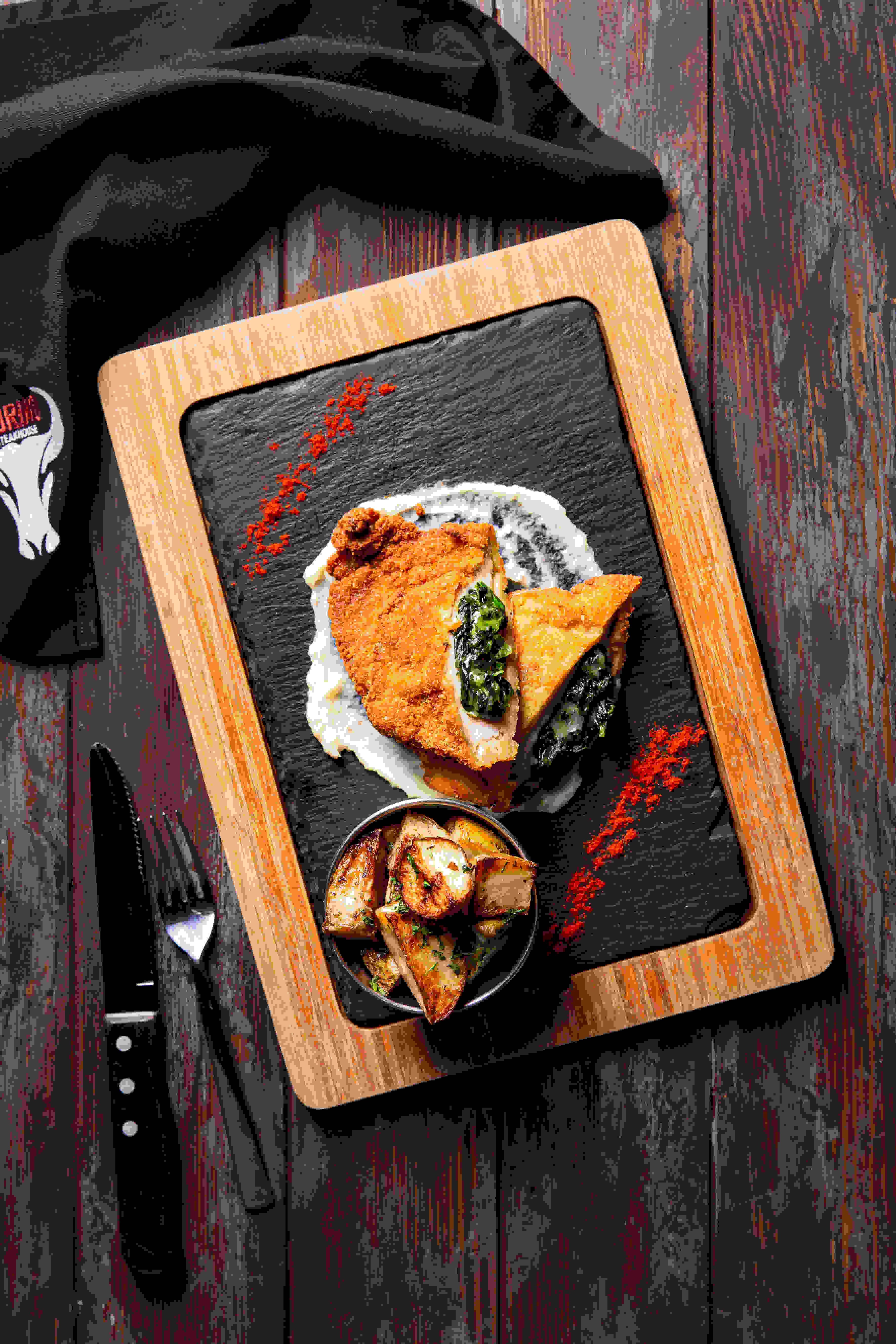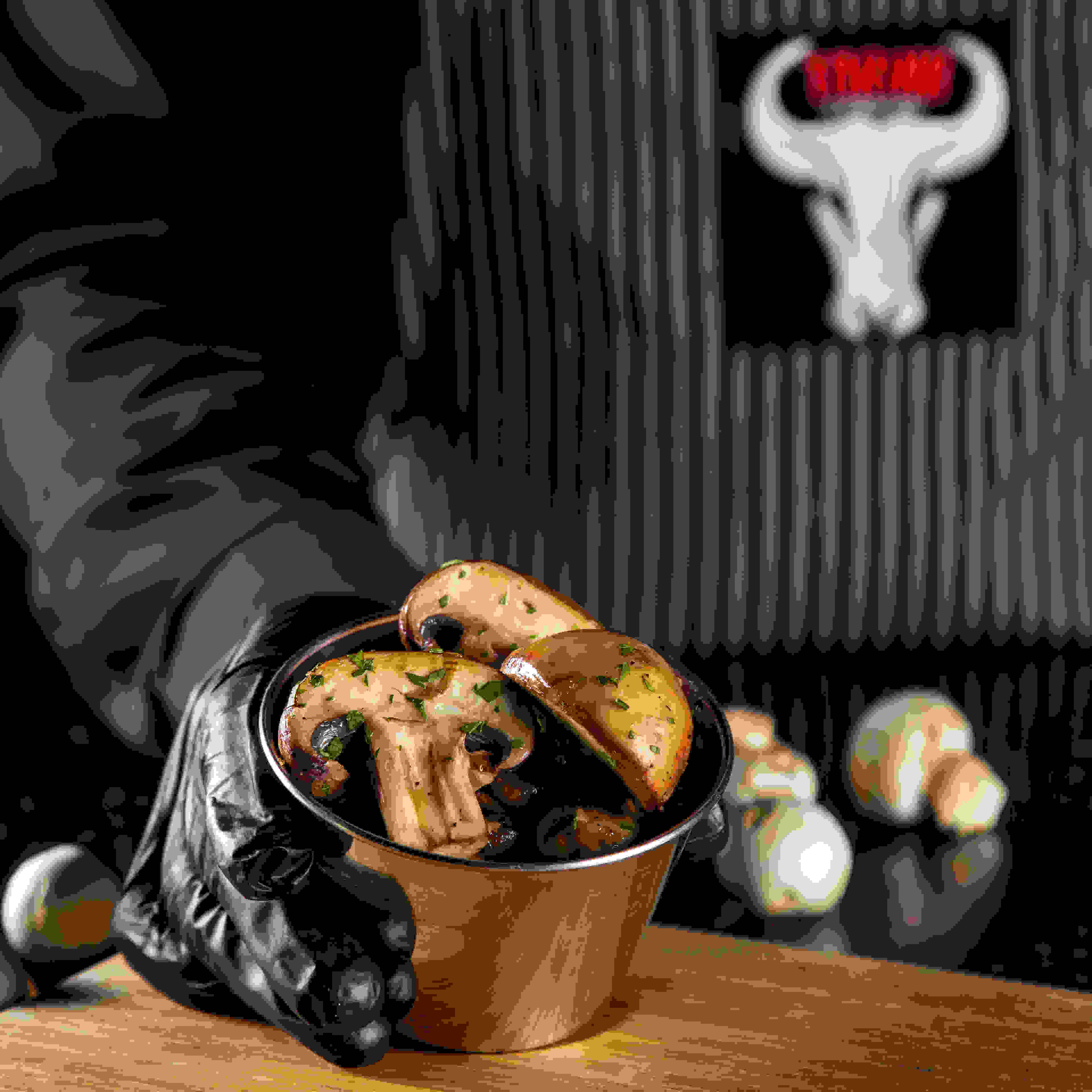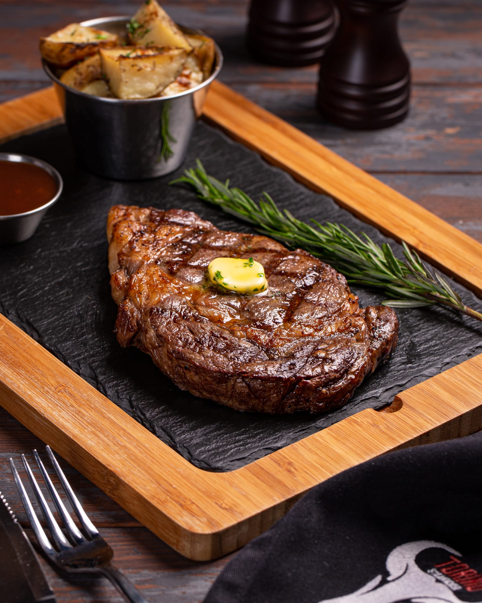 indulge your steak with one of our homemade sauces (creamy mushroom, mixed peppercorn, bleu cheese, bbq relish, and creamy garlic served with your choice of mashed potato, french fries, roasted herb potato, roasted vegetables, and sauteed mushroom