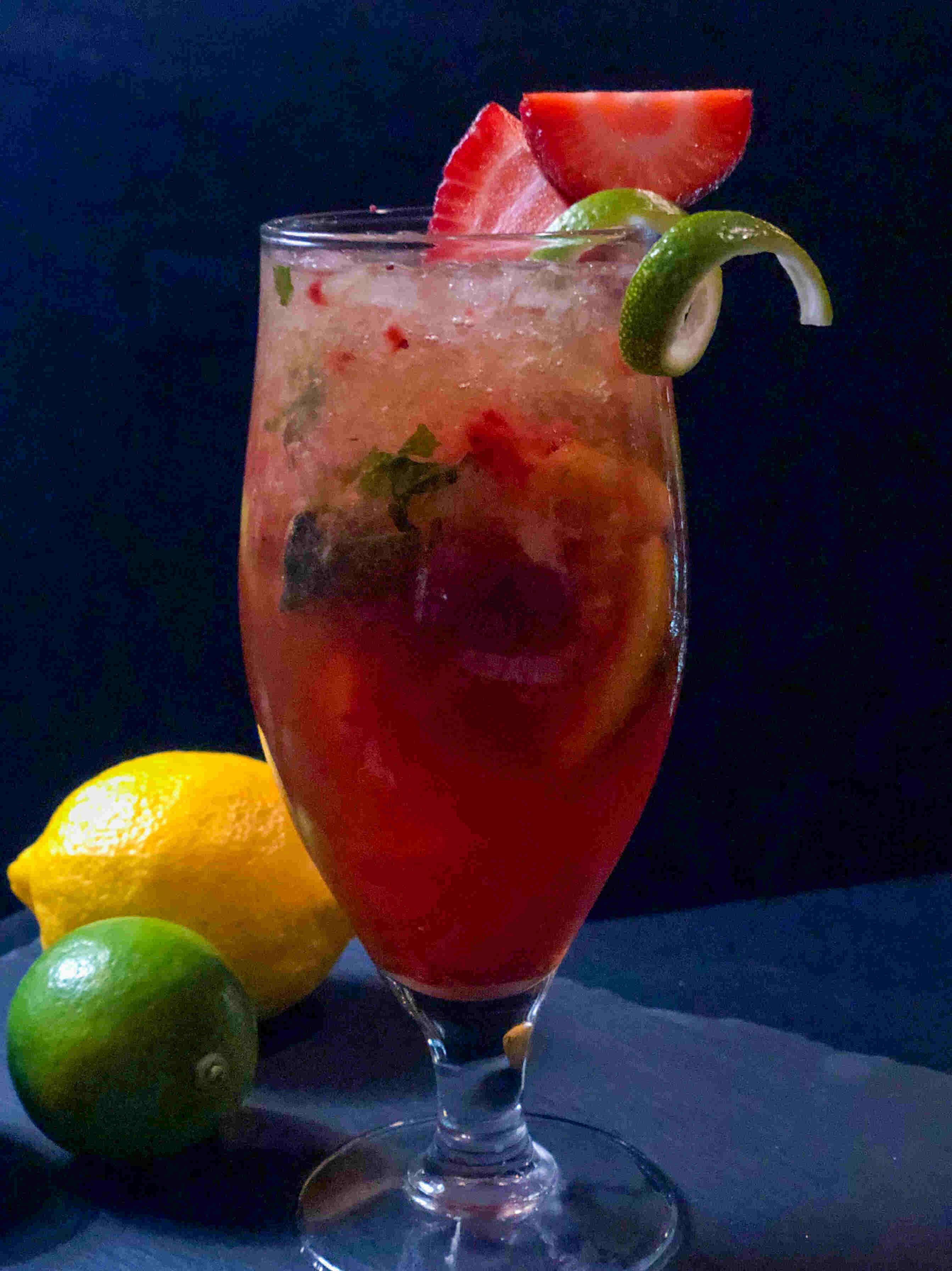 fresh lime juice, fresh lime fruits, sugar, mint leaves, club soda, strawberry fruit, served over crushed ice
