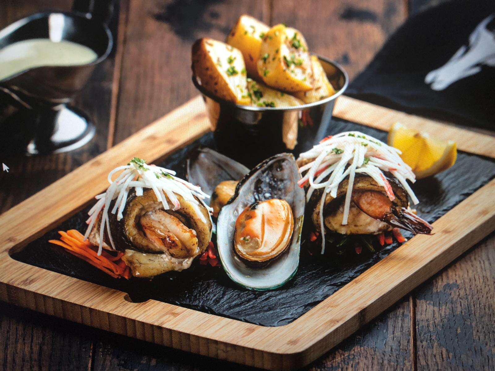 روبيان(٨٠غرام) كلماري(١٥٠غرام) وسمك السي باس (١٢٥غرام) مع صوص التارجون ٧٨ ق ر