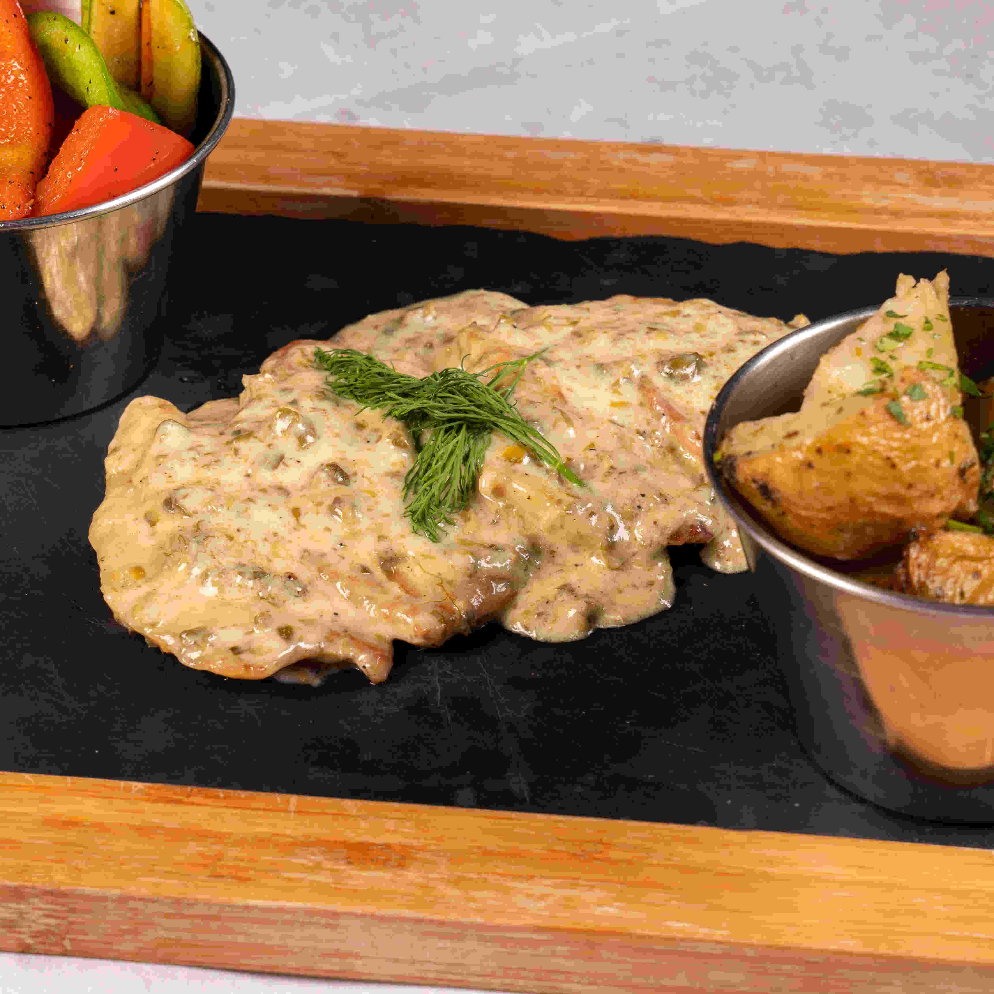 صدر دجاج (150 جرام) متبل بصلصة فريدة محلية الصنع ، اختيارك (صلصة أعشاب متقنة أو فطر دسم أو صلصة الشبت الليمون) ويقدم مع بطاطس محمرة وخضروات منزلية