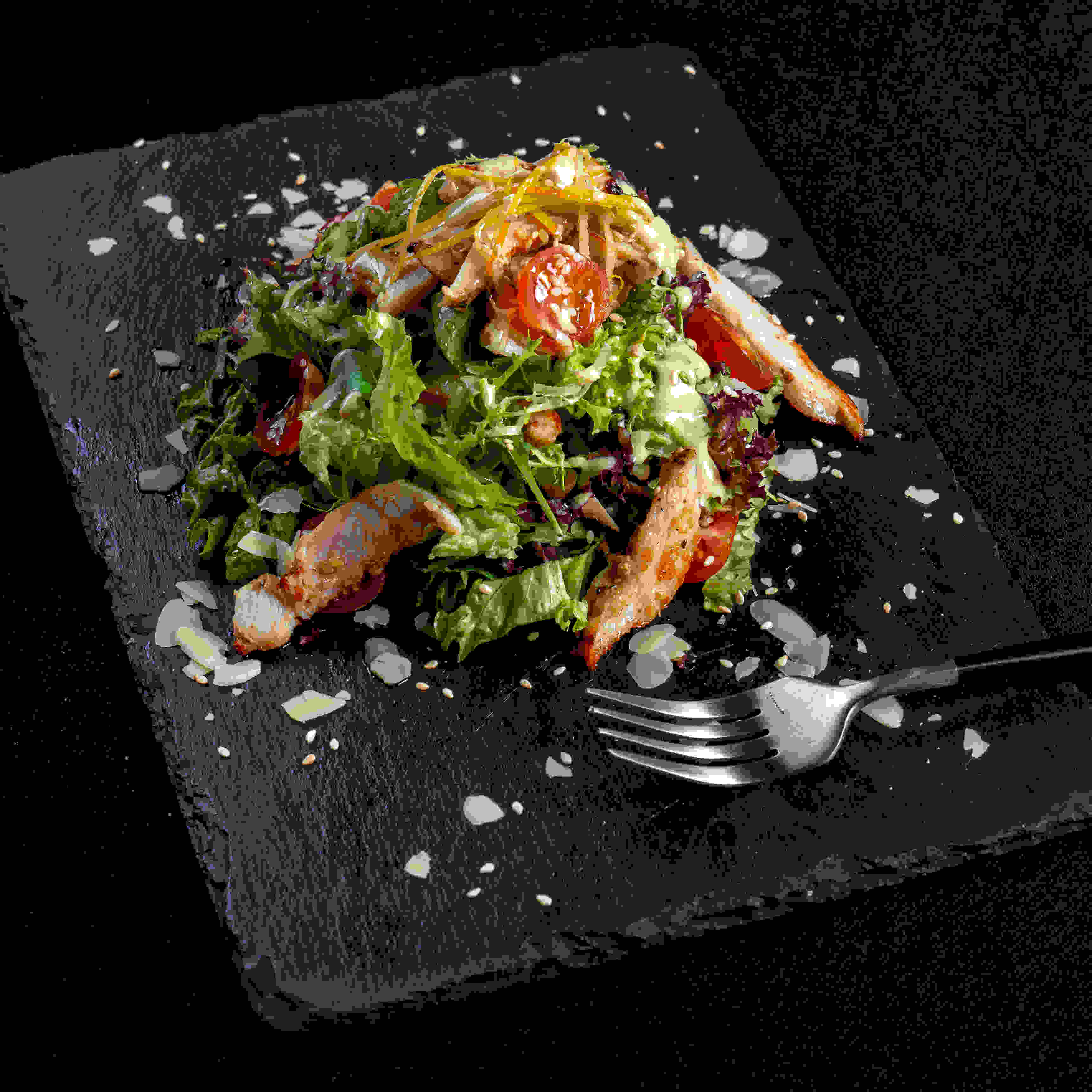 أوراق خضراء موسمية وأوراق جارجر مع طماطم كرزية و دجاج مشوي متبل (150 جرام) مغطاة بالسمسم واللوز المحمص يقدم مع صلصة الريحان الخل * يحتوي على المكسرات