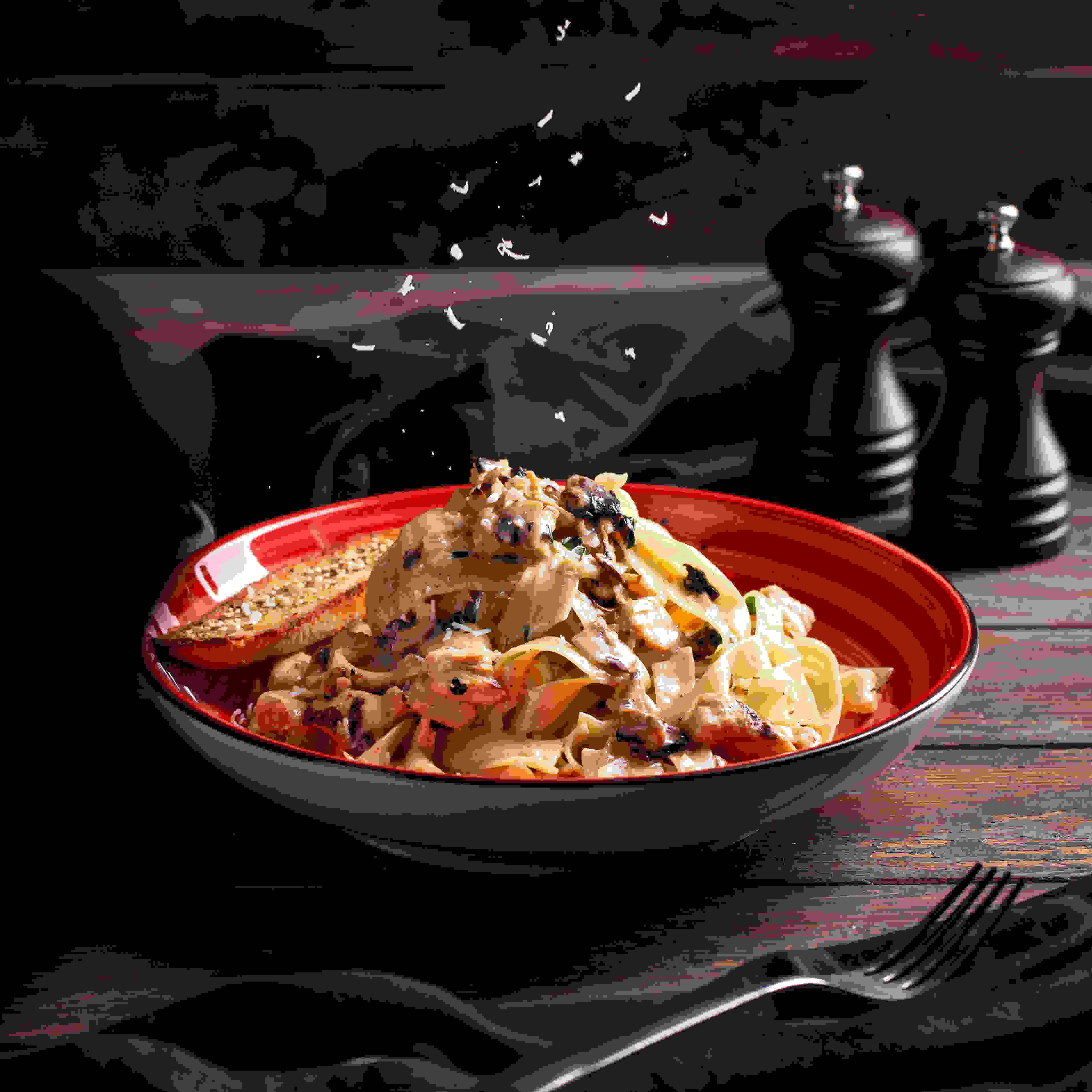 باستا فيتوتشيني مطبوخة مع فطر طازج بصلصة الريحان الإيطالية الكريمية و الدجاج المدخن (160 جرام) مغطاة بجبنة البارميزان