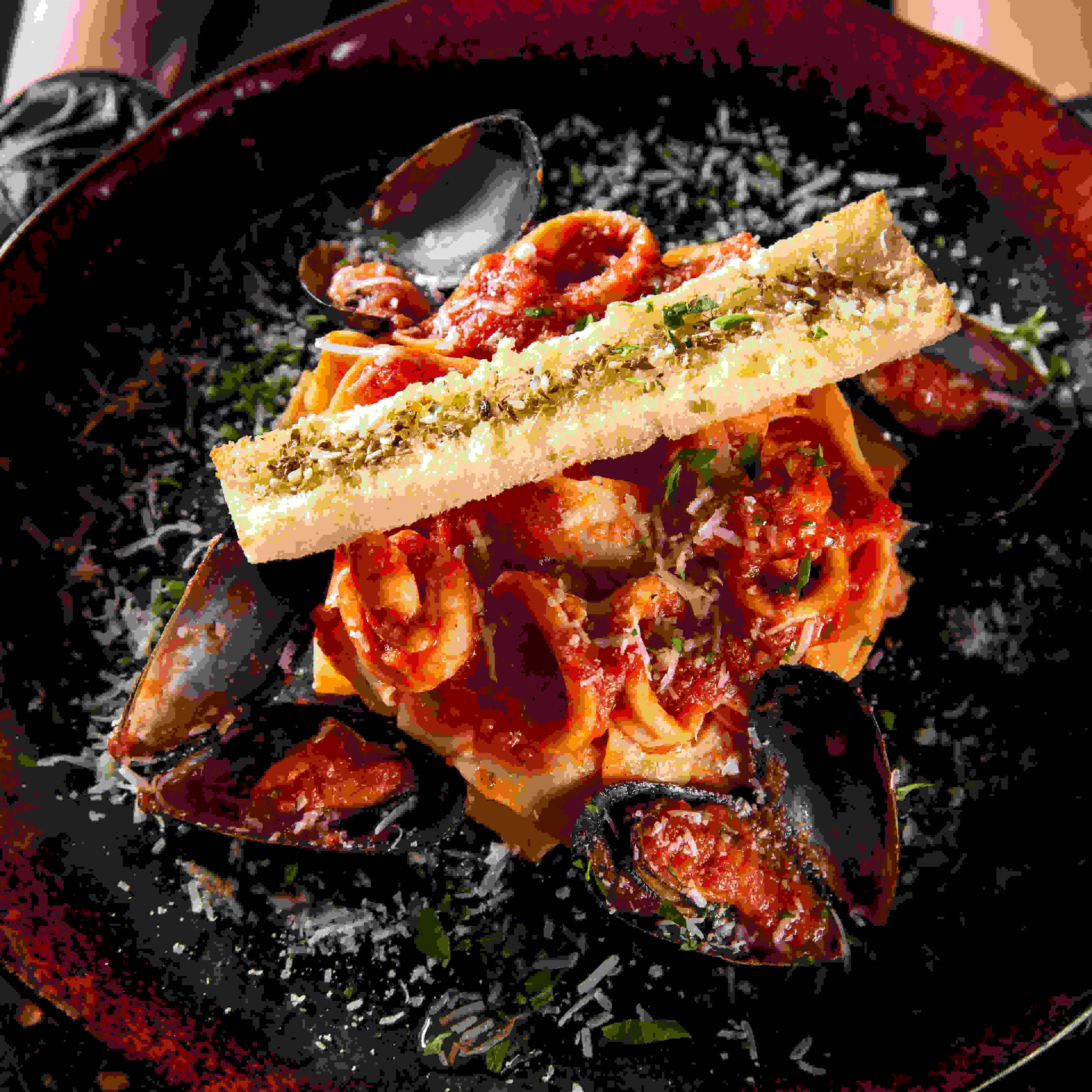 كلماري وروبيان ومحار البحر(١٤٠غرام) تقدم مع صوص الطماطم الغني ٨٥ ق ر