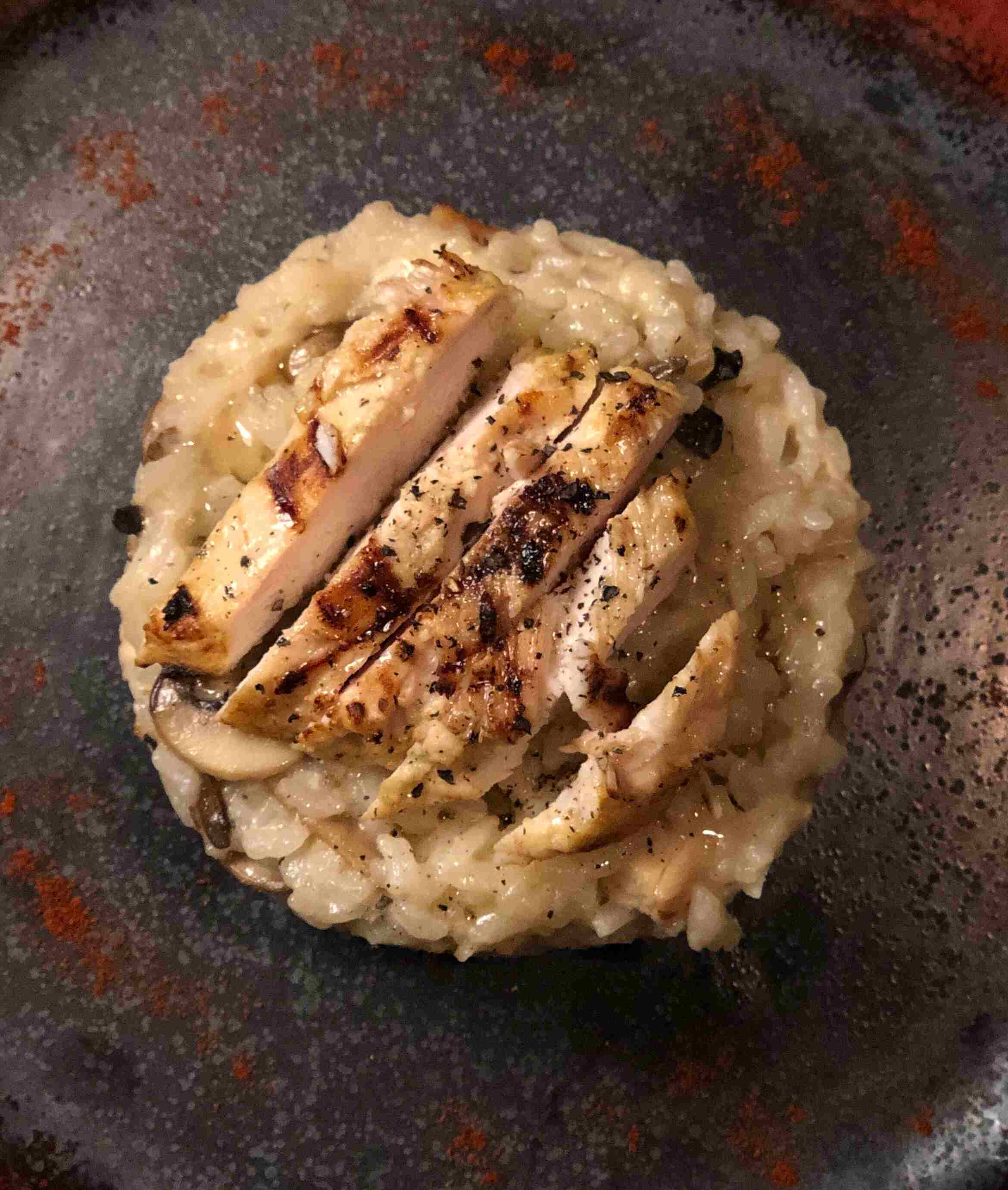 ريزوتو مع المشروم البري والثوم مع شرائح الدجاج(٨٠غرام) المشوي ٦٠ ق ر