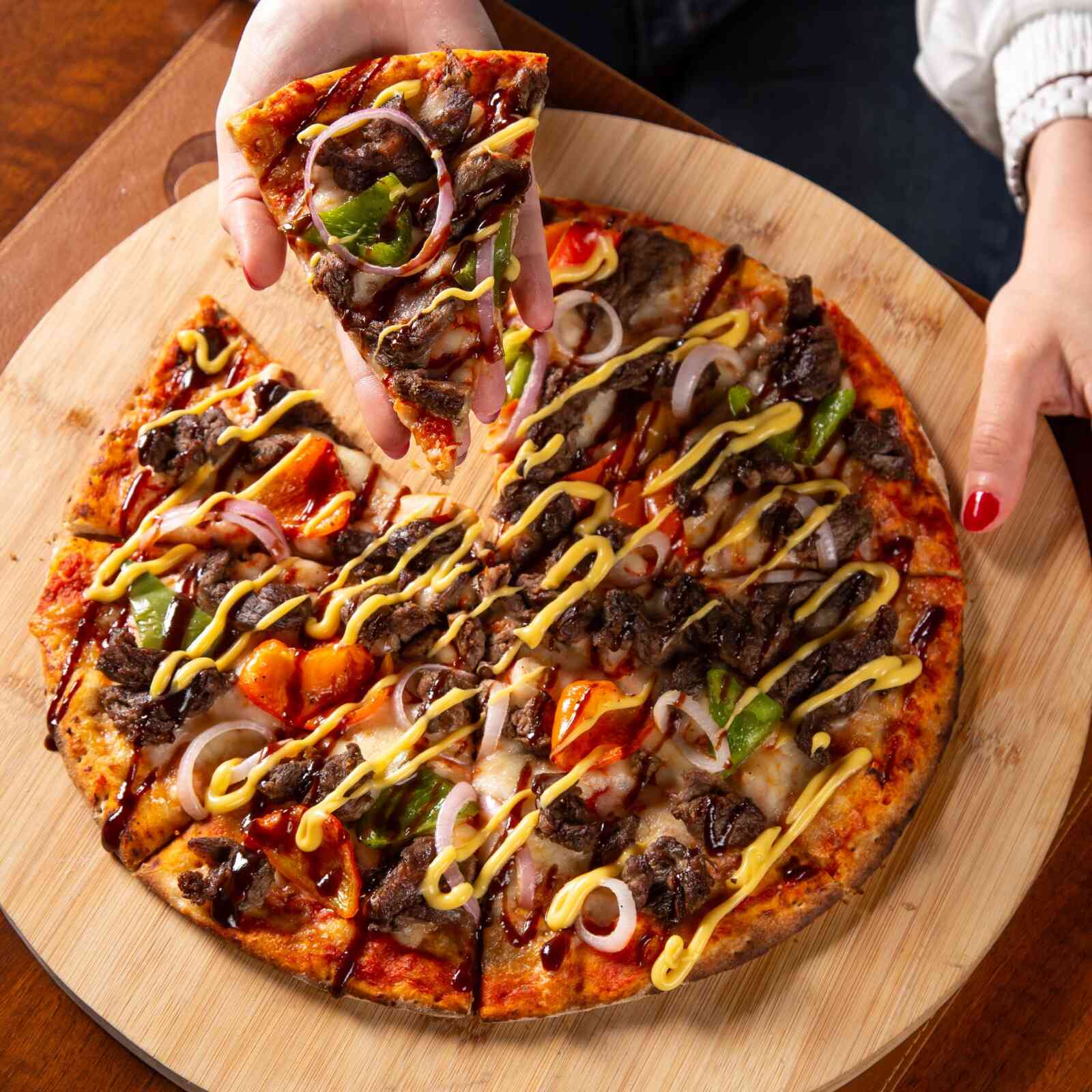 عجينة سميكة محضرة منزليًا ، مغطاة بصلصة بيضاء ، جبنة موتزاريلا أوفرلود ، شريحة رقيقة من لحم أنجوس بقري أمريكي معتمد ، فلفل أخضر مقرمش ، بصل مكرمل ، فطر طازج ،