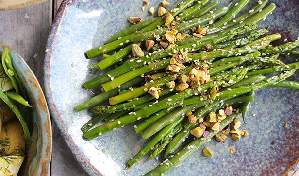 الخضار الطازجة المطبوخة مع مزيج خاص من الأعشاب الإيطالية مختلطة مع الريحان الطازج * يحتوي على المكسرات