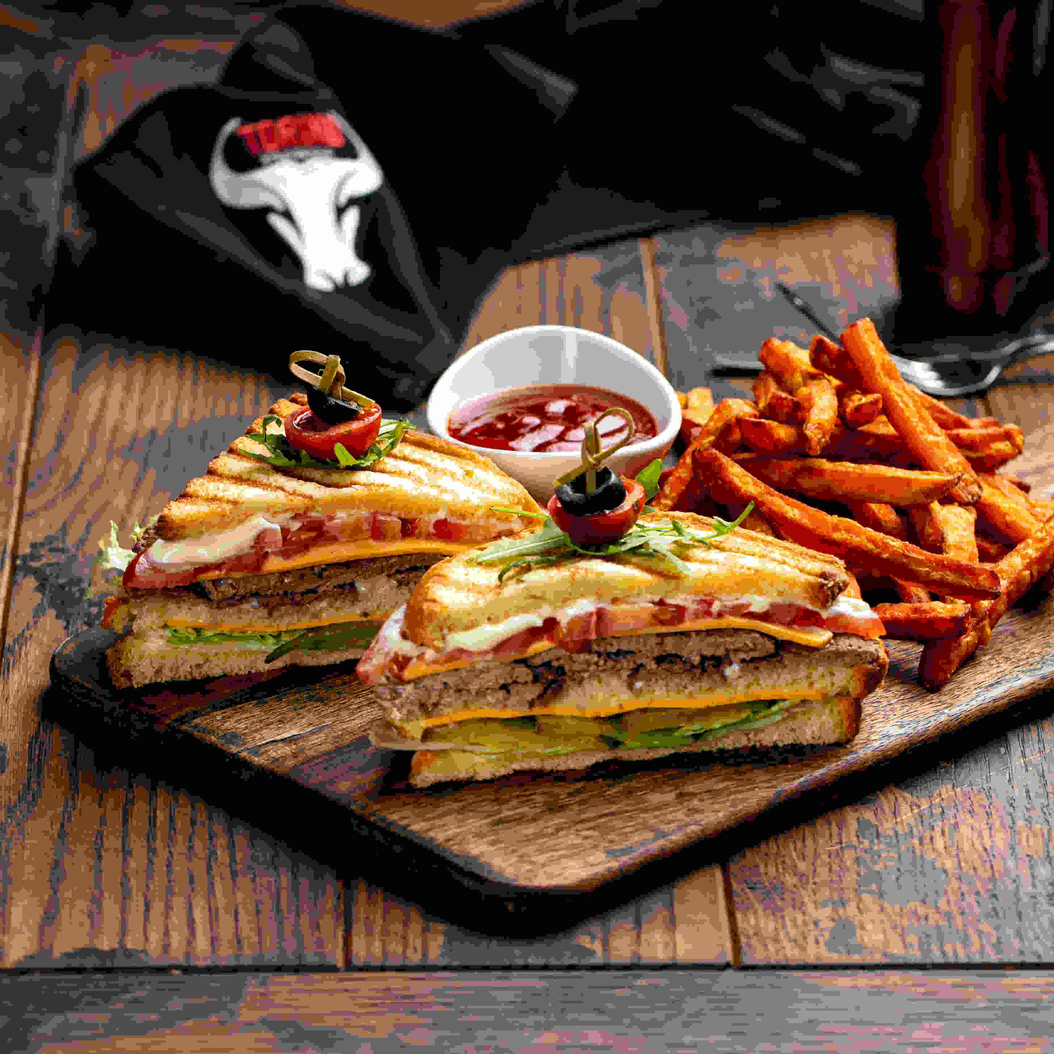 كلاسيك كلوب هاوس ، اختيارك من خبز القمح البني الصحي أو خبز البريوش ، مغطى بمجموعة متنوعة من الخس ، شريحة طماطم البرقوق ، مخلل خيار رقيق ، أومليت ، شرائح لحم أنجوس بيكون ، مايونيز كريمي وشرائح جبن شيدر أمريكي مع شرائح ستيك كت أو بطاطا حلوة رقائق