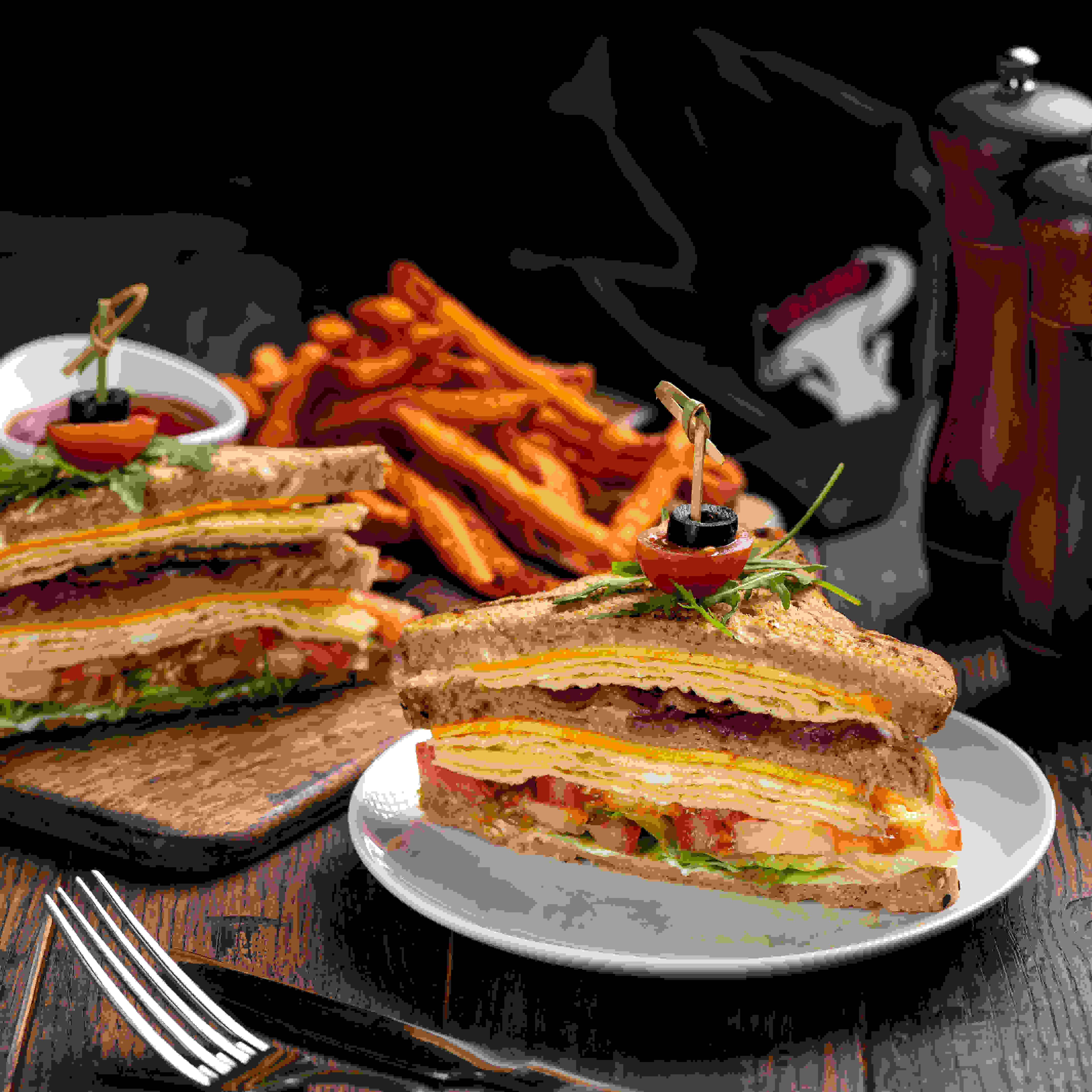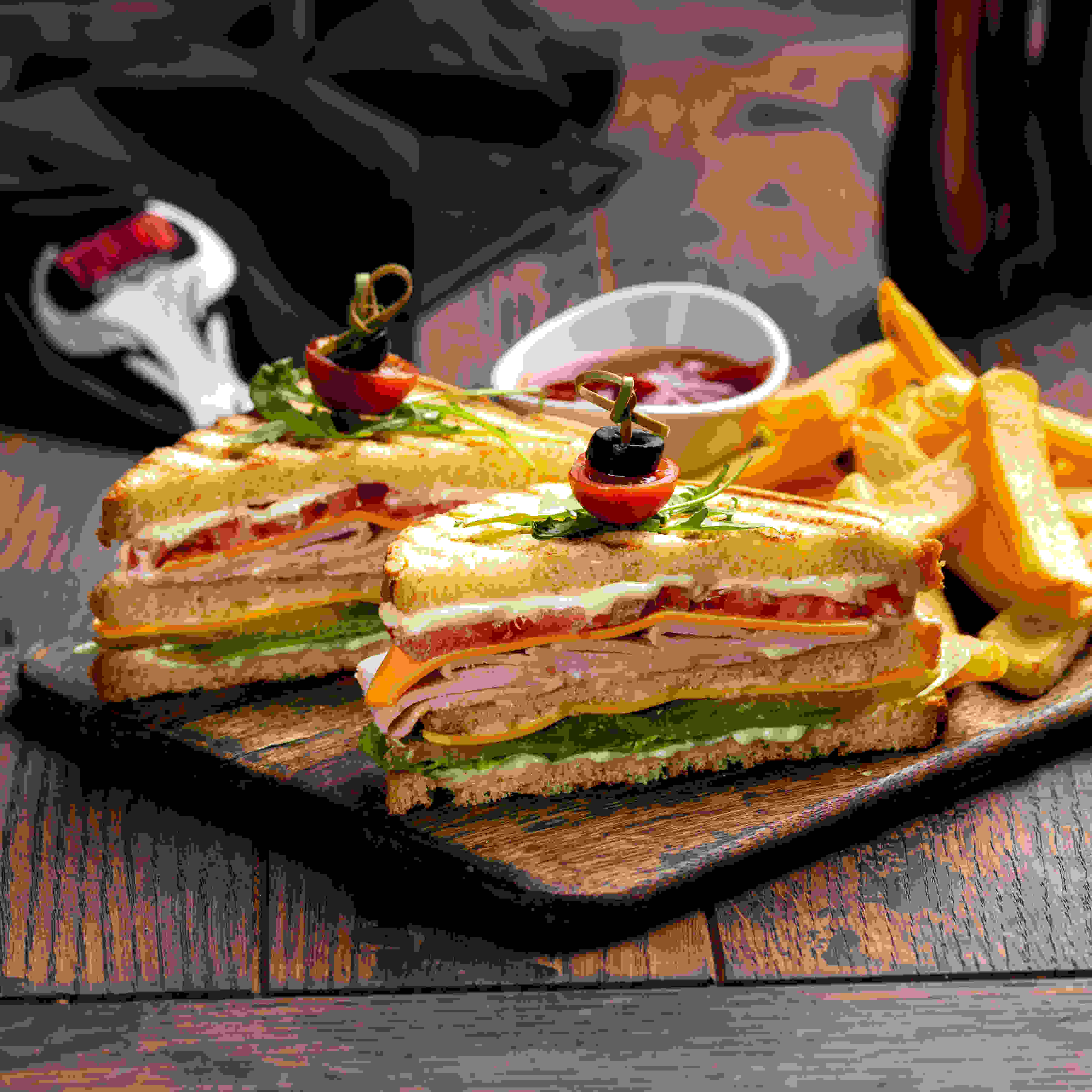 كلاسيك كلوب هاوس ، اختيارك من خبز القمح البني الصحي أو خبز البريوش ، مغطى بمجموعة متنوعة من الخس ، شريحة طماطم البرقوق ، مخلل خيار رقيق ، أومليت ، لحم ديك رومي مدخن ، مايونيز كريمي وشرائح جبن شيدر أمريكي مع شرائح ستيك كت أو رقائق بطاطا حلوة