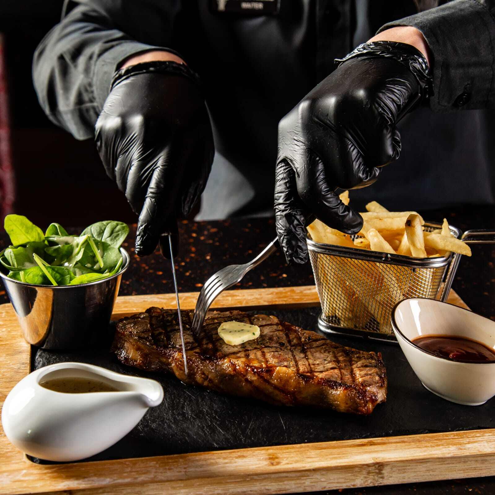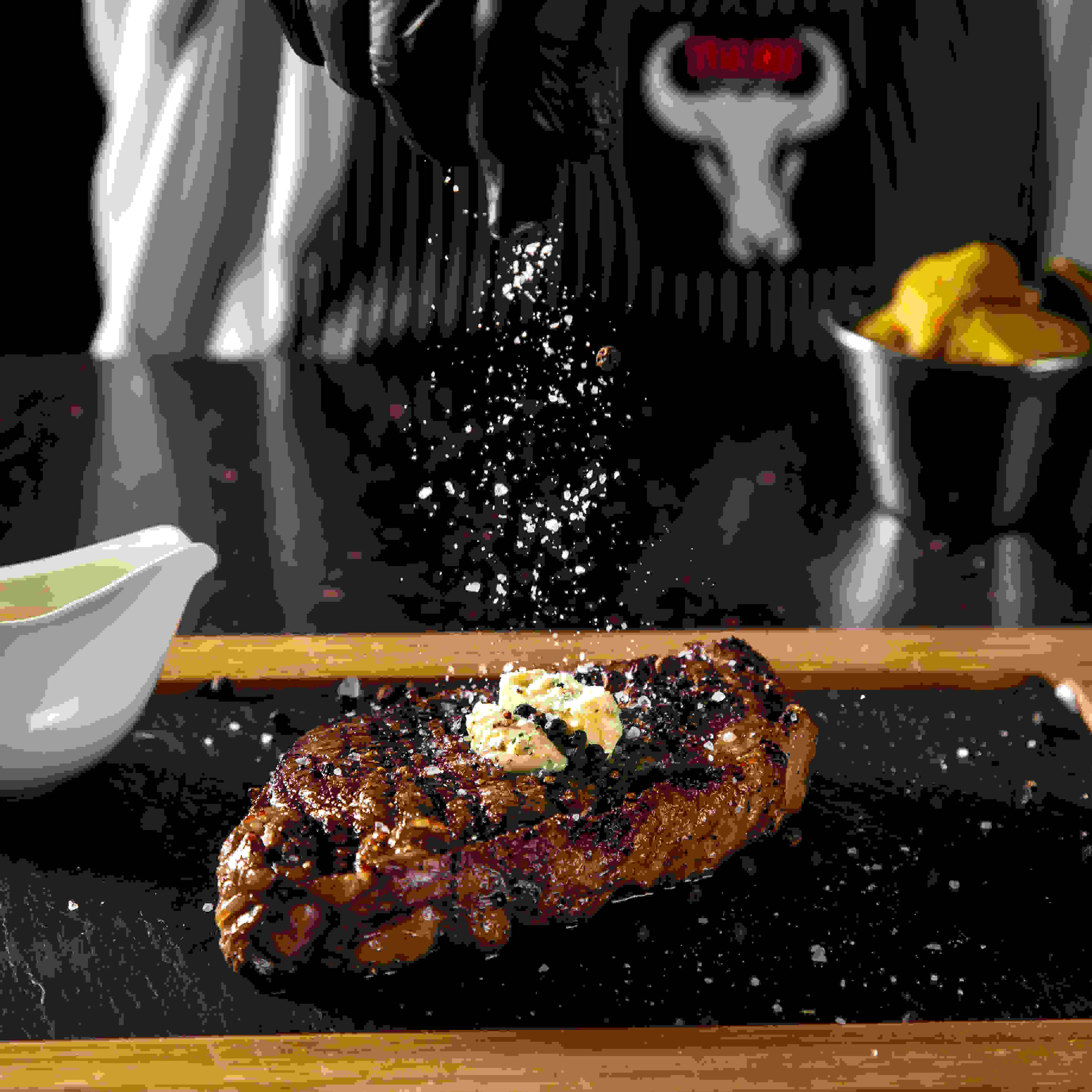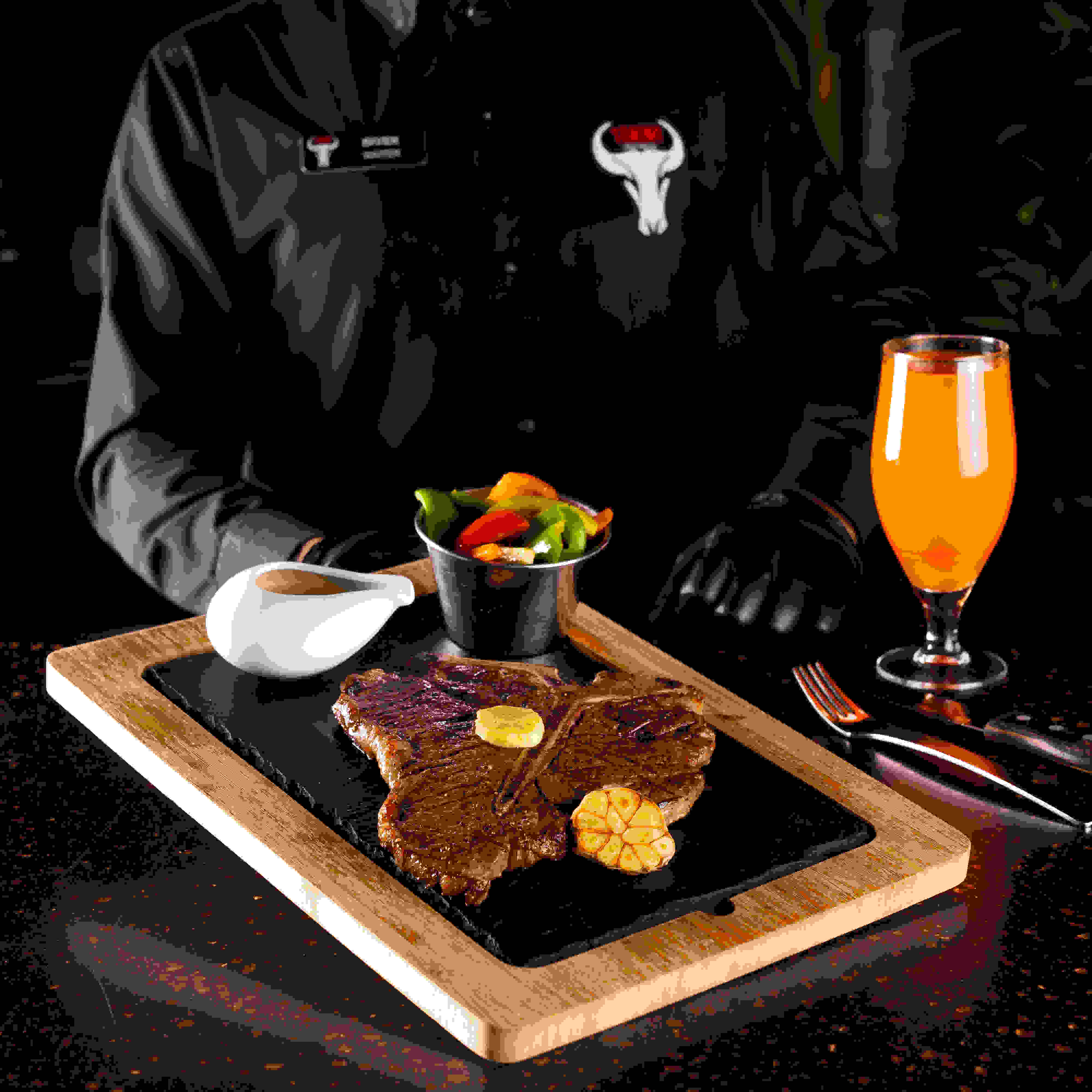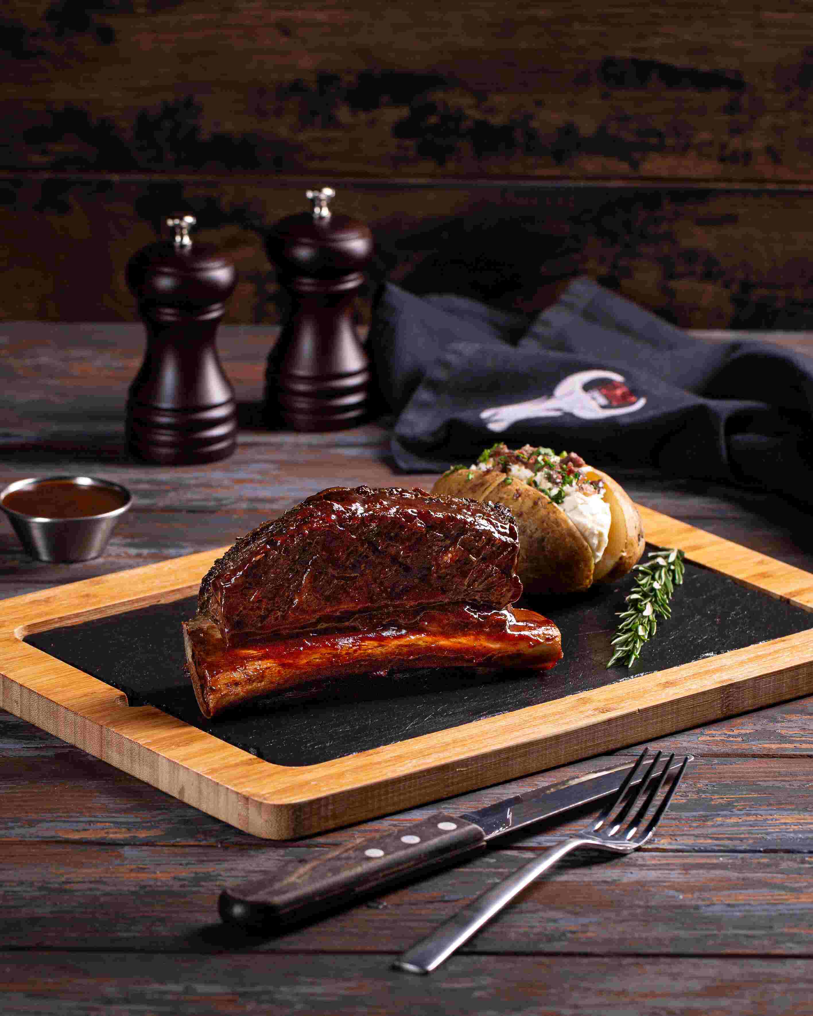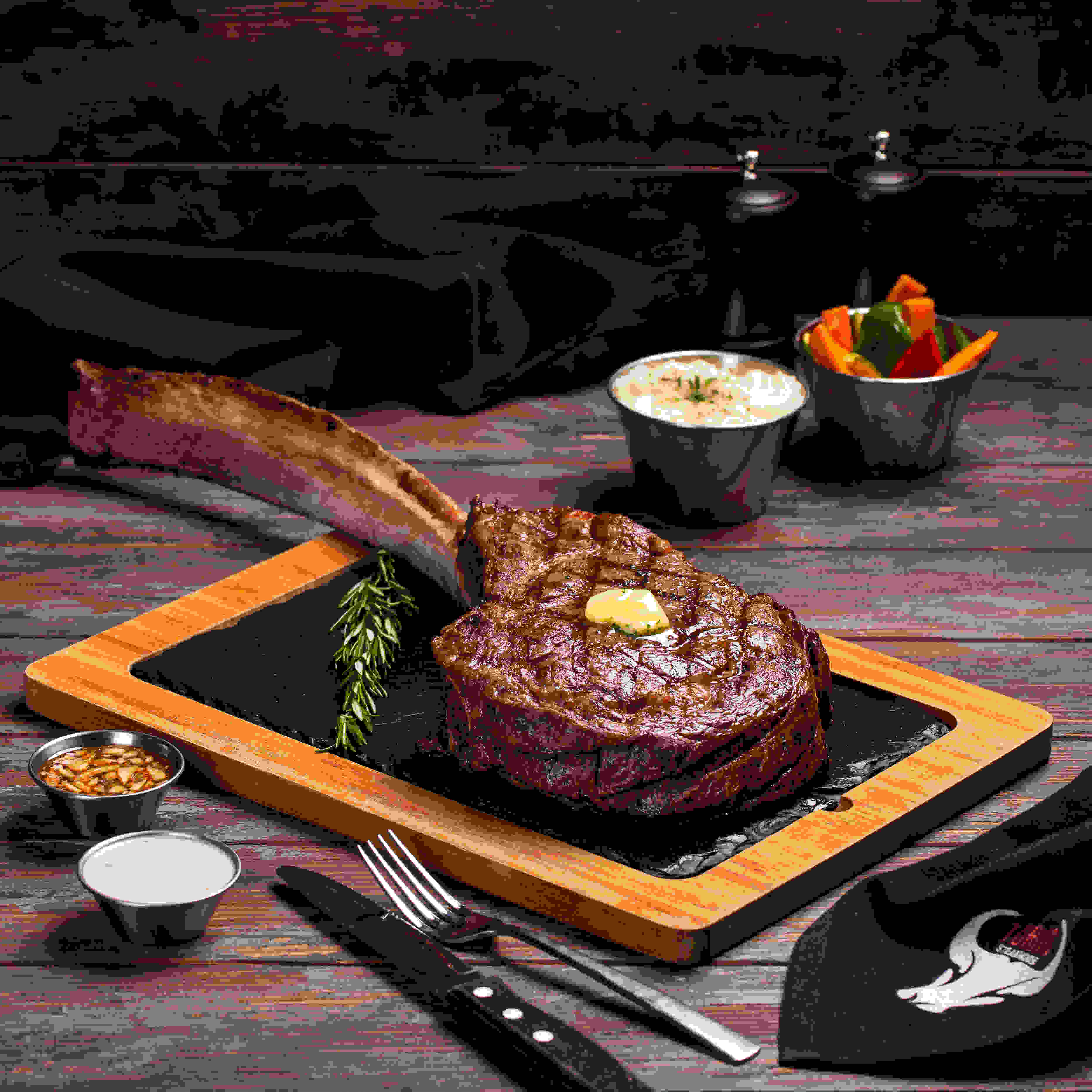 The dinner table discussion point!!! our specialty on-the bone rib steak, cut from the fore-rib with the entire rib bone left. the long bone is french-trimmed, leaving an amazing mouthwatering presentation