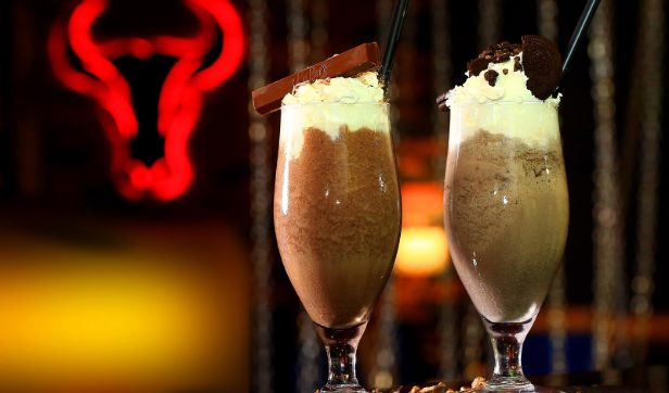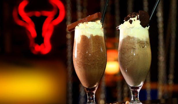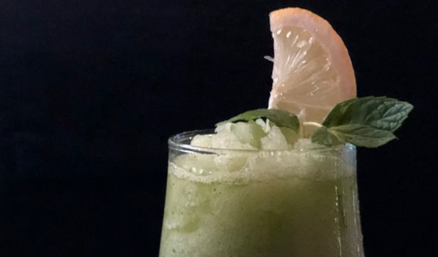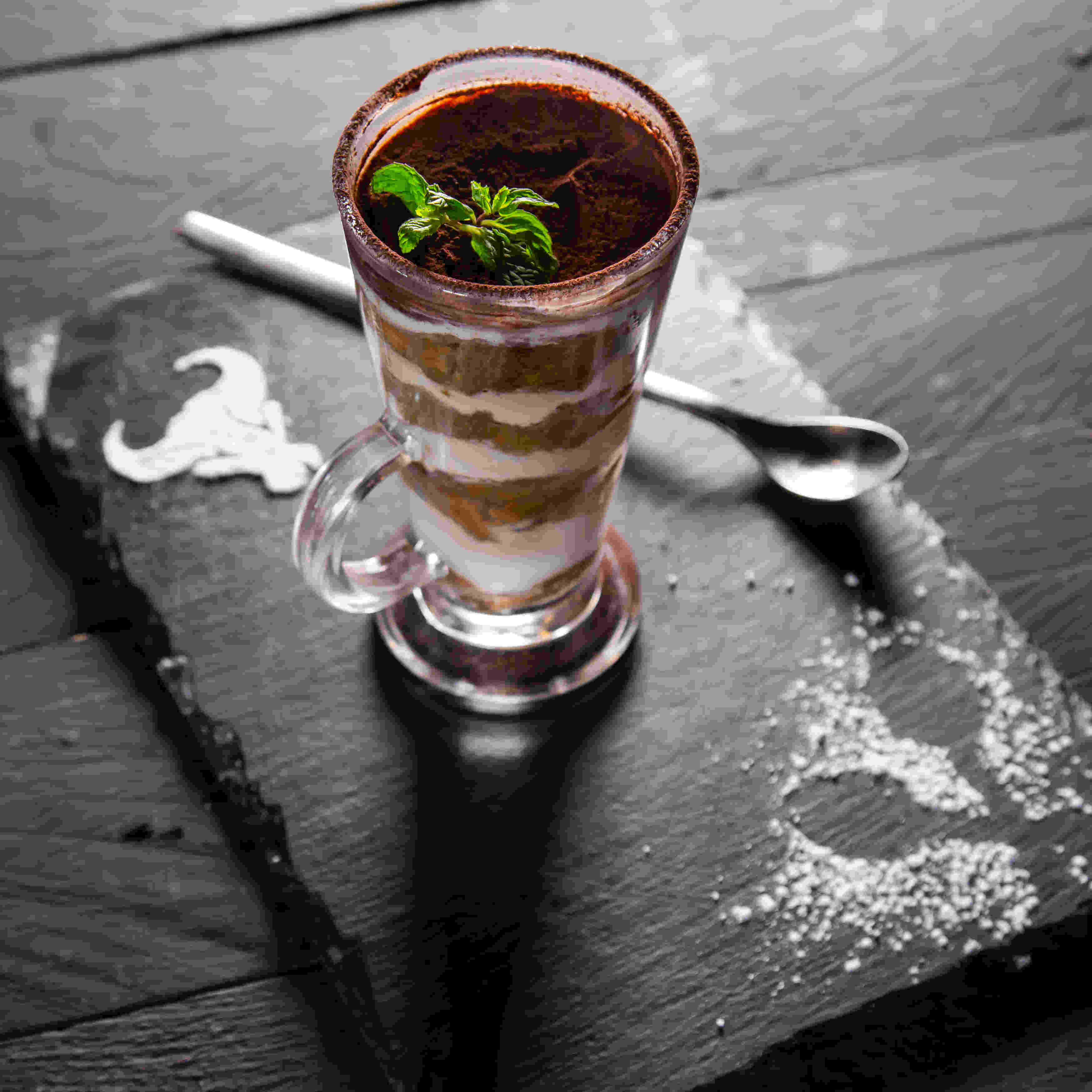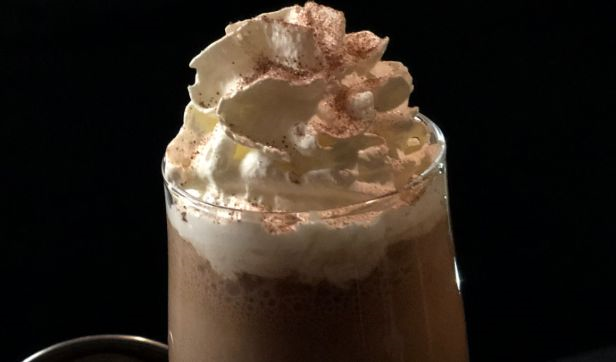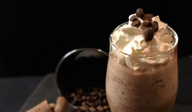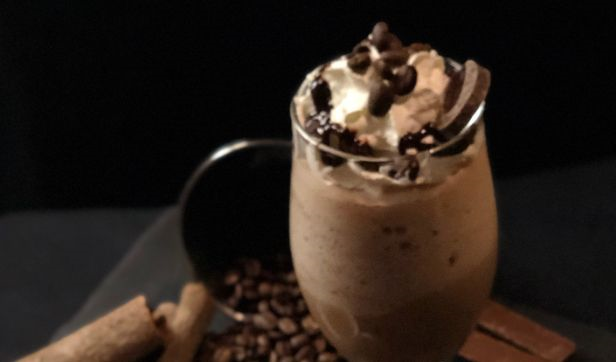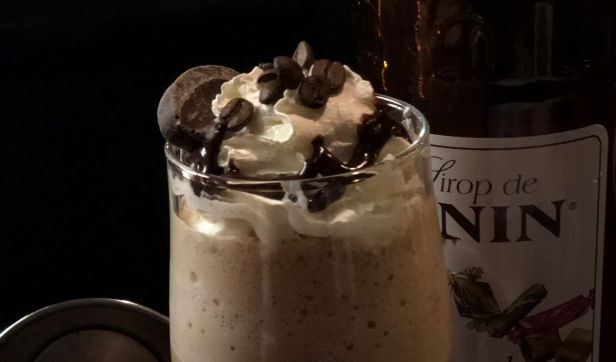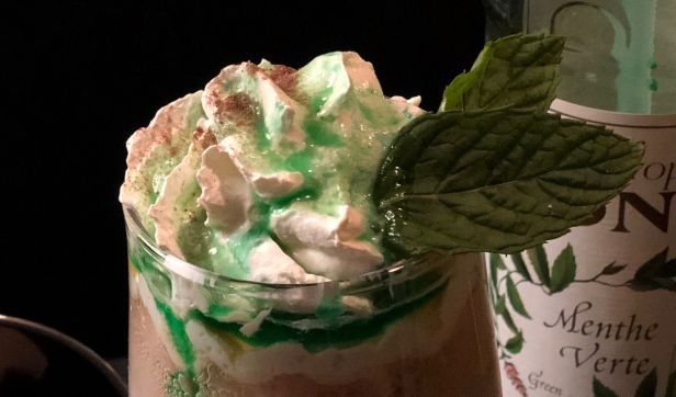lime of iced blended mocha served with mint syrup, garnish with whipped cream, chocolate sauce and fresh mint leaves