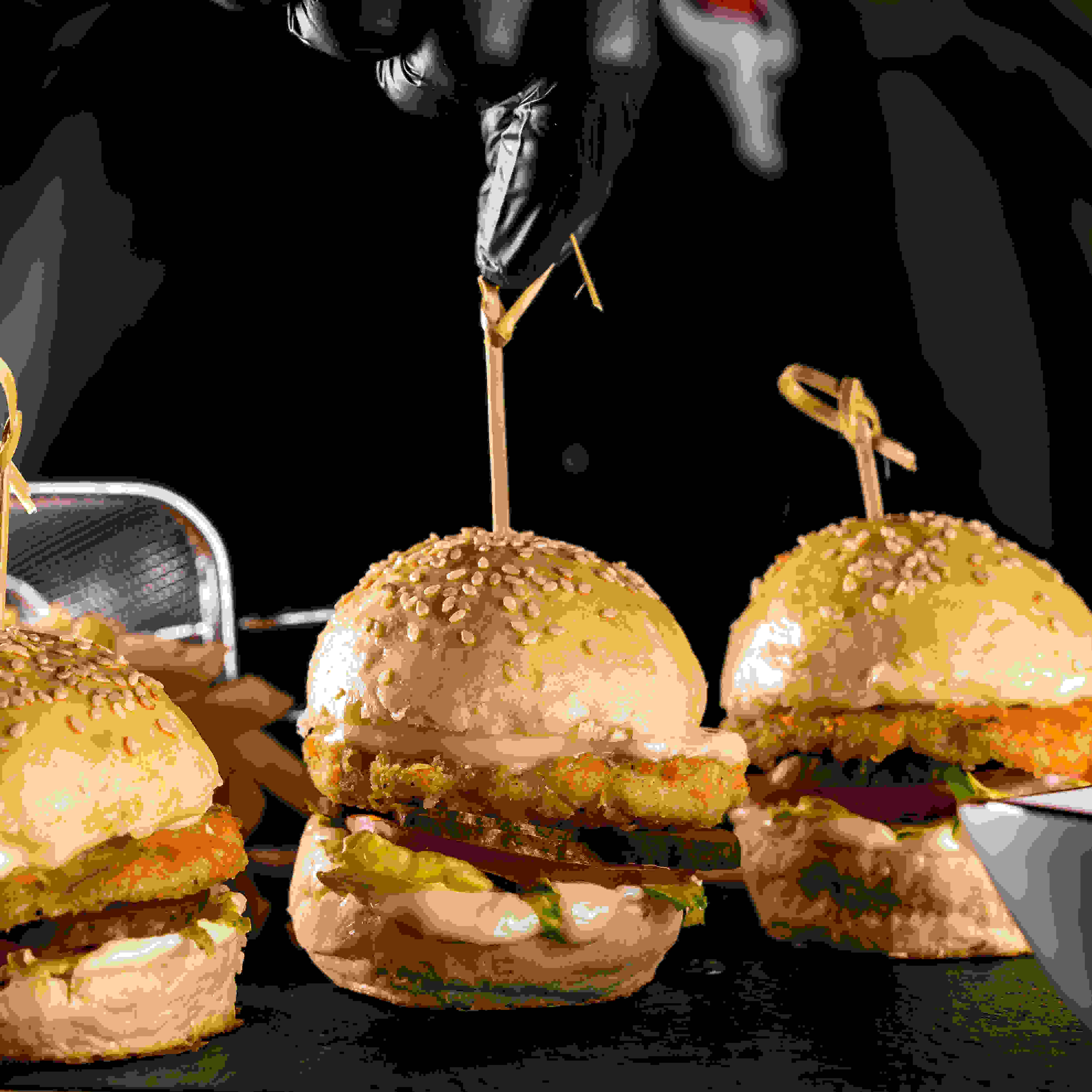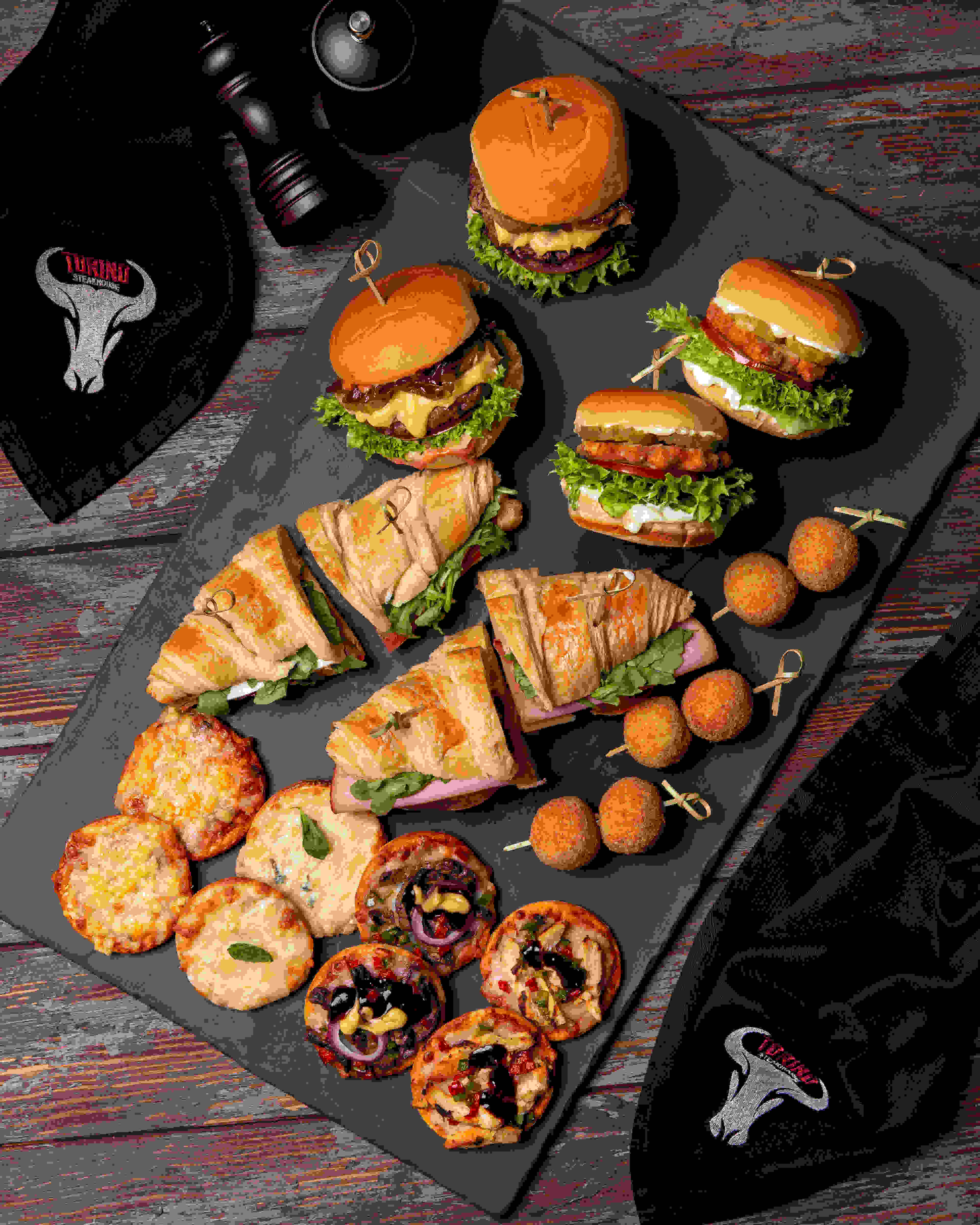 Combination of your favorite mini beef and chicken burger, mini mix pizza, half croissant of halloumi and turkey swiss croissant and sides of mini risotto balls