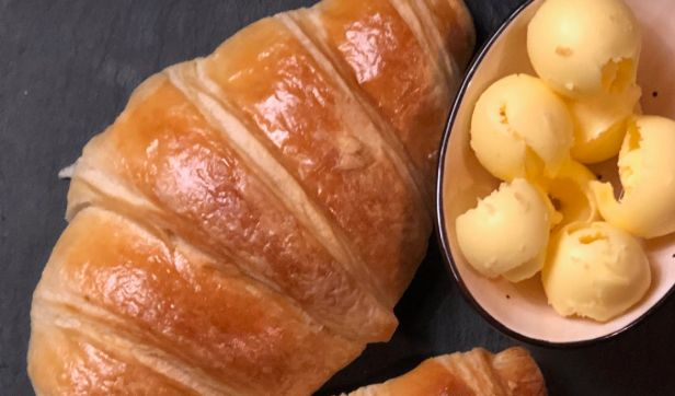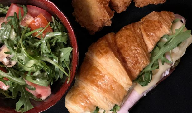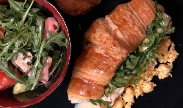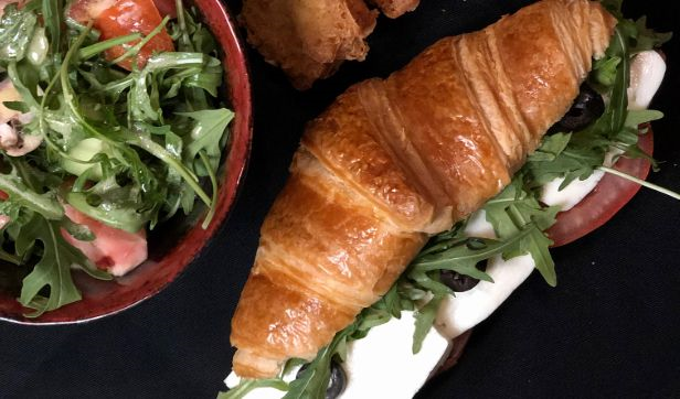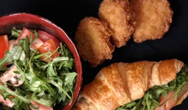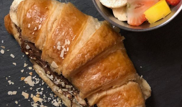 Fresh Croissant stuffed with Slices of Smoked Turkey, Emmental Cheese, Pickles, Fresh Tomato served with Morning Fresh side Salad and Hash Browns