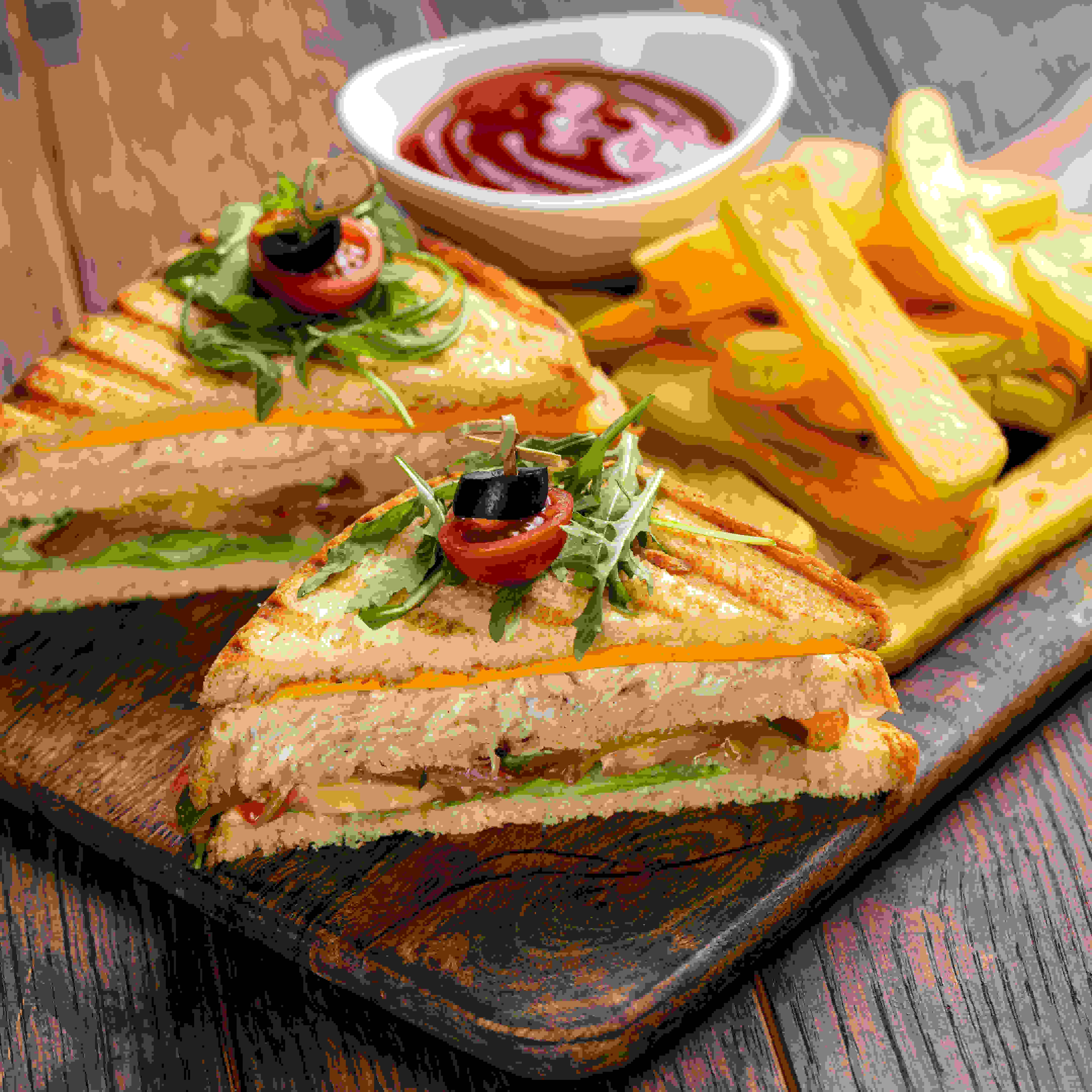 كلاسيك كلوب هاوس ، اختيارك من خبز القمح البني الصحي أو خبز البريوش ، مغطى بمجموعة متنوعة من الخس ، شريحة طماطم البرقوق ، مخلل خيار رقيق ، شرائح دجاج مشوية بالكريمة ، وشرائح جبن شيدر أمريكي مع شرائح ستيك كت أو رقائق بطاطا حلوة