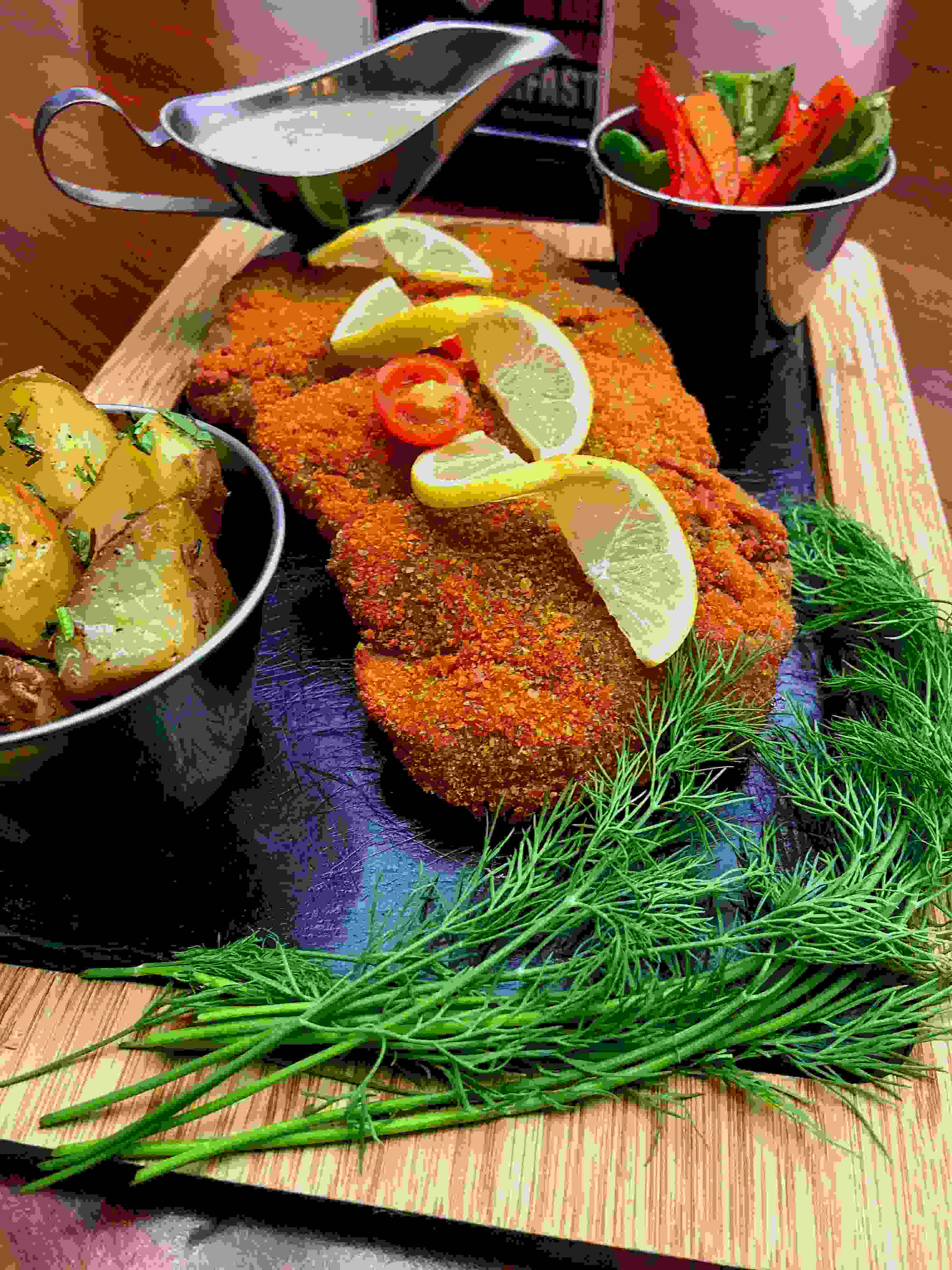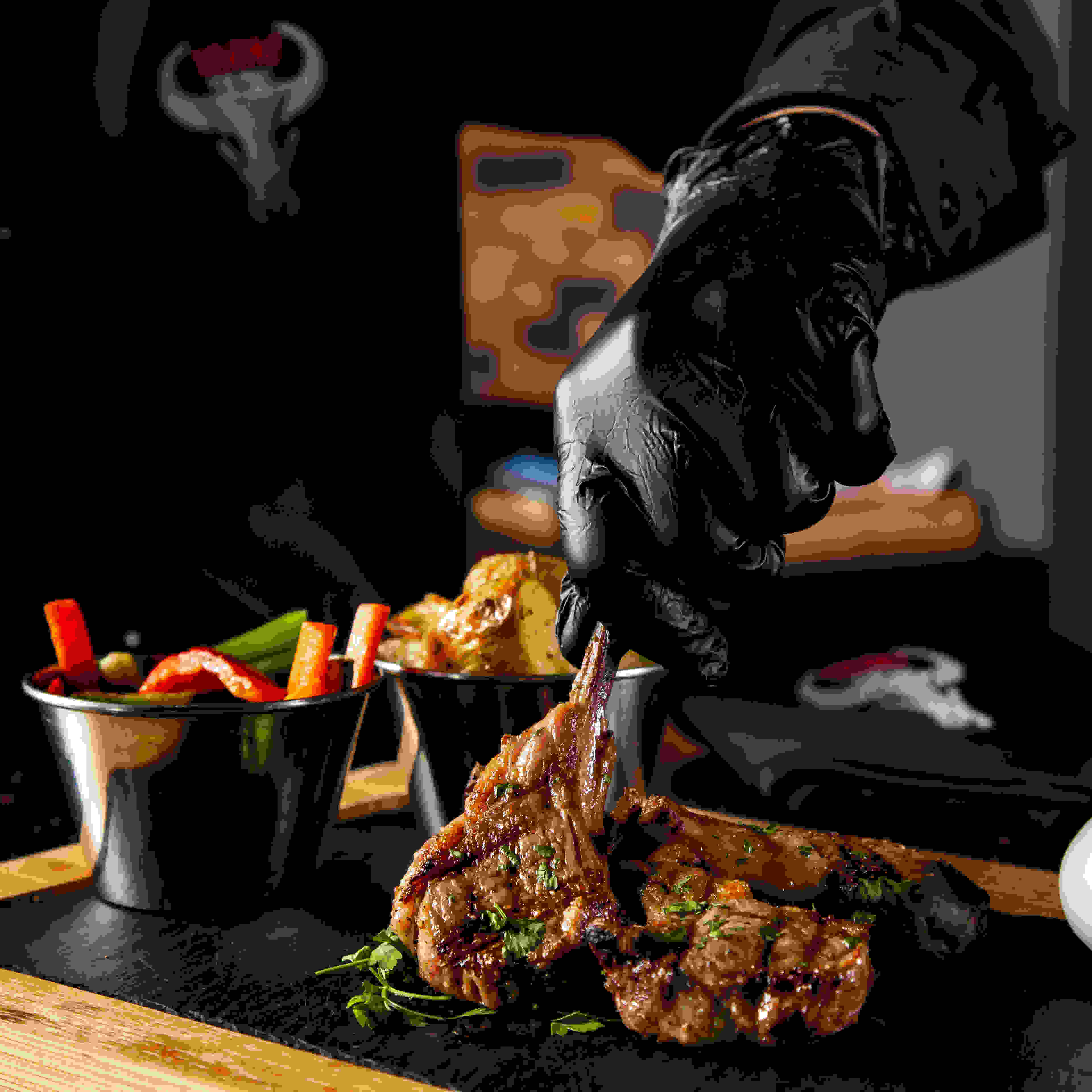 grilled lamb cutlets (240-260 grams) marinated with fresh mix roasted herbs and our chefs spices served with homemade sauce and vegetables and potato