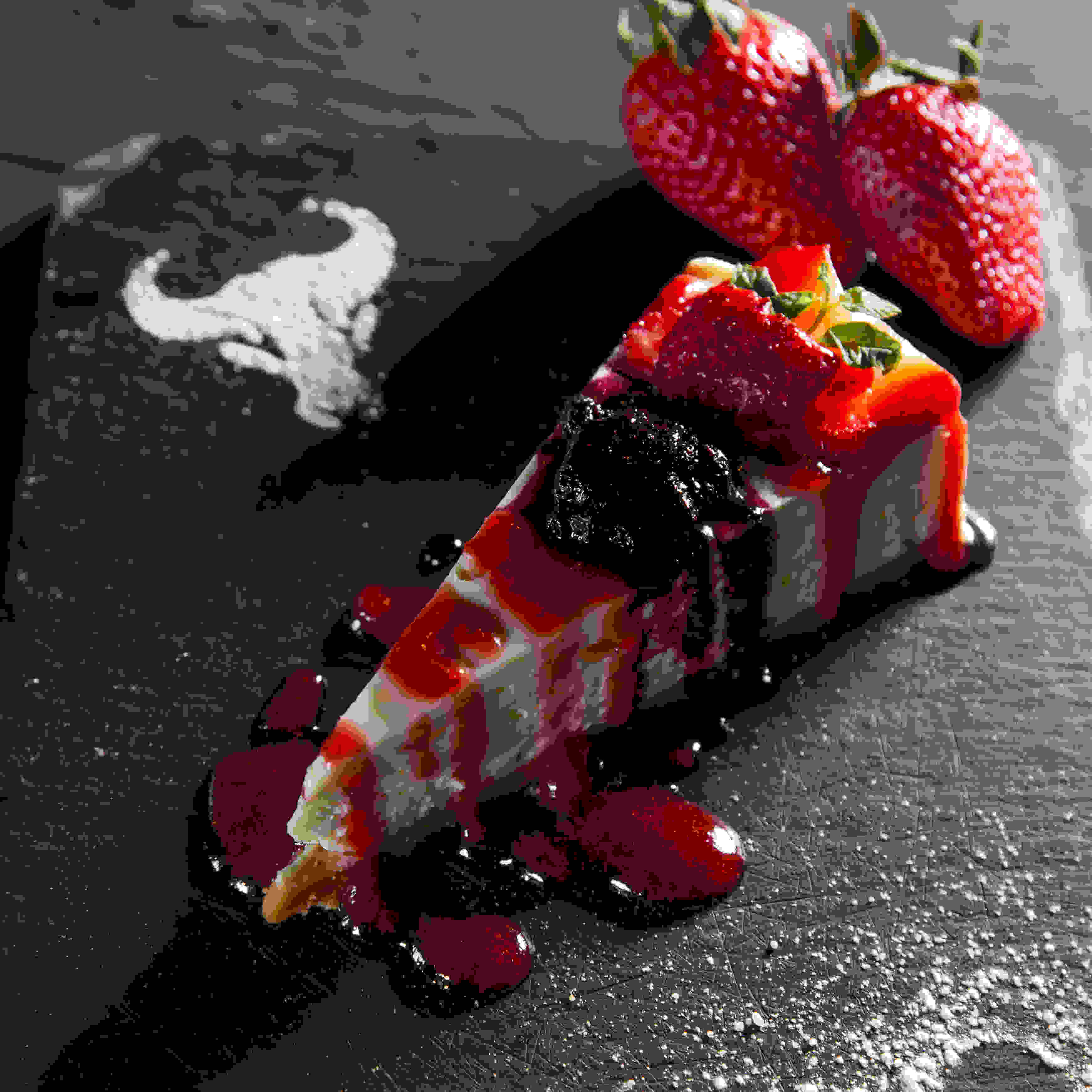 Delight yourself with a bite of our flavorful cheesecake Strawberry, Blueberry, mango, seasalt caramel