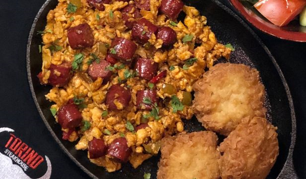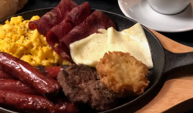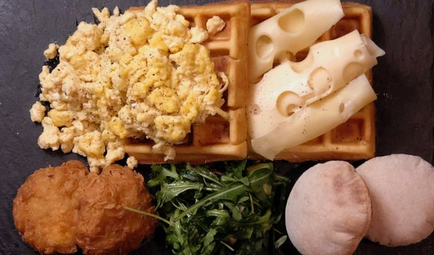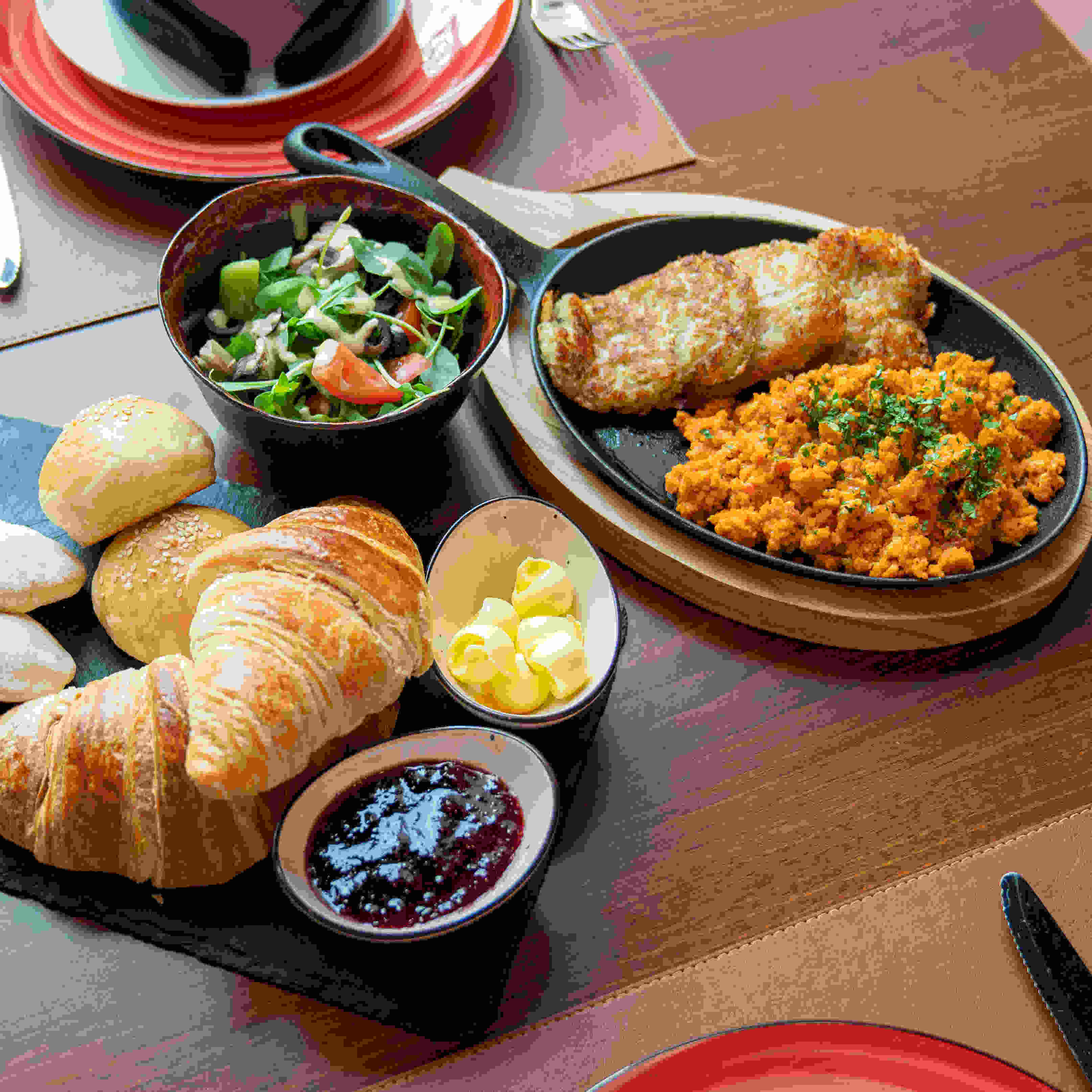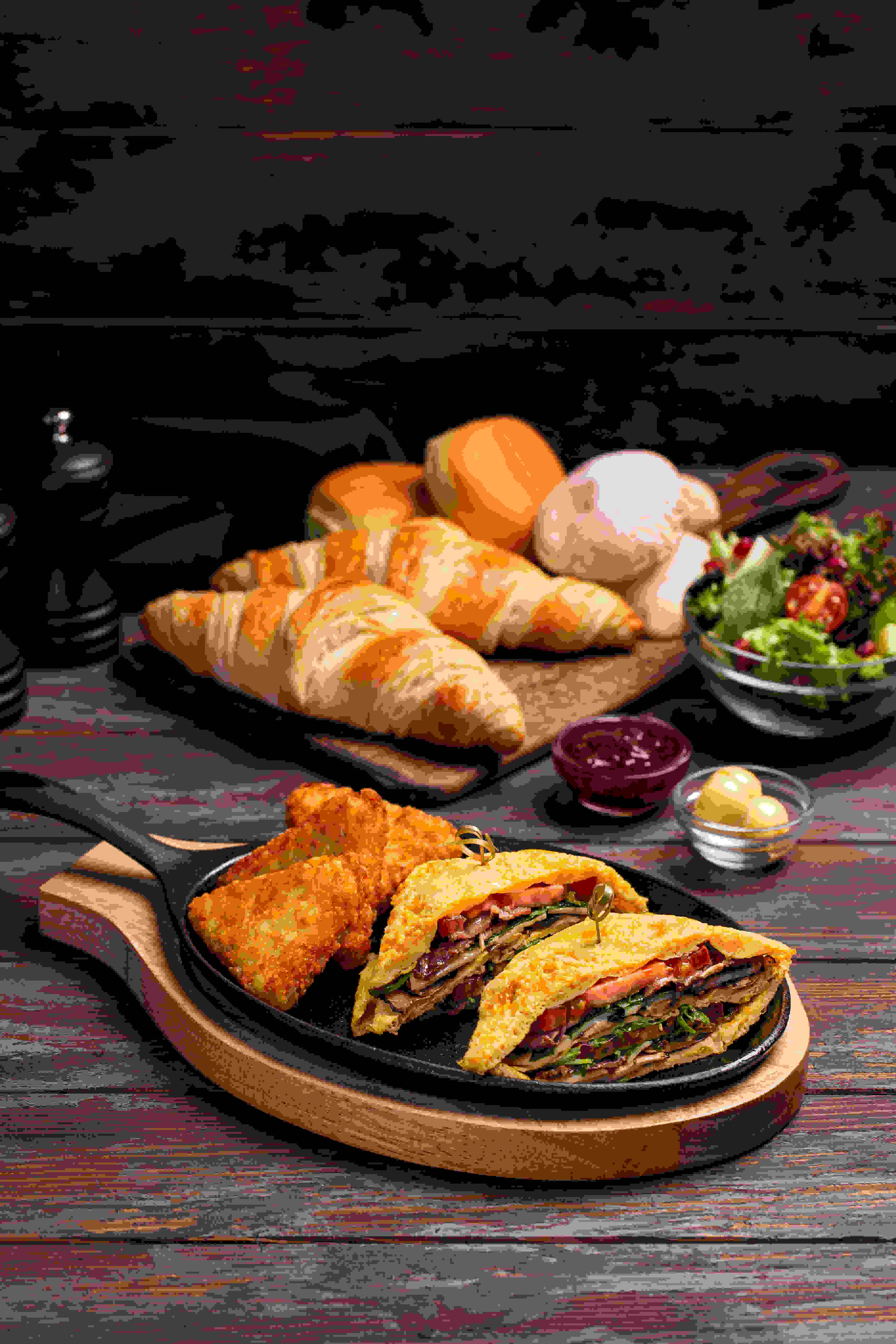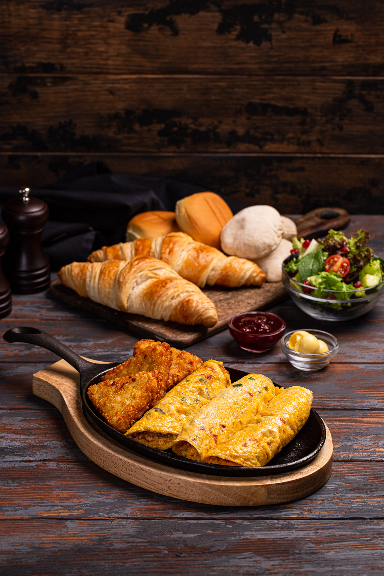 Freshly made egg rolls mixed with fresh tomatoes, mixed capsicum, fresh mushroom, Emmental cheese served with pastry basket (2 plain croissant, 3 mini torino bread, 2 mini buns) morning side salad and hash brown