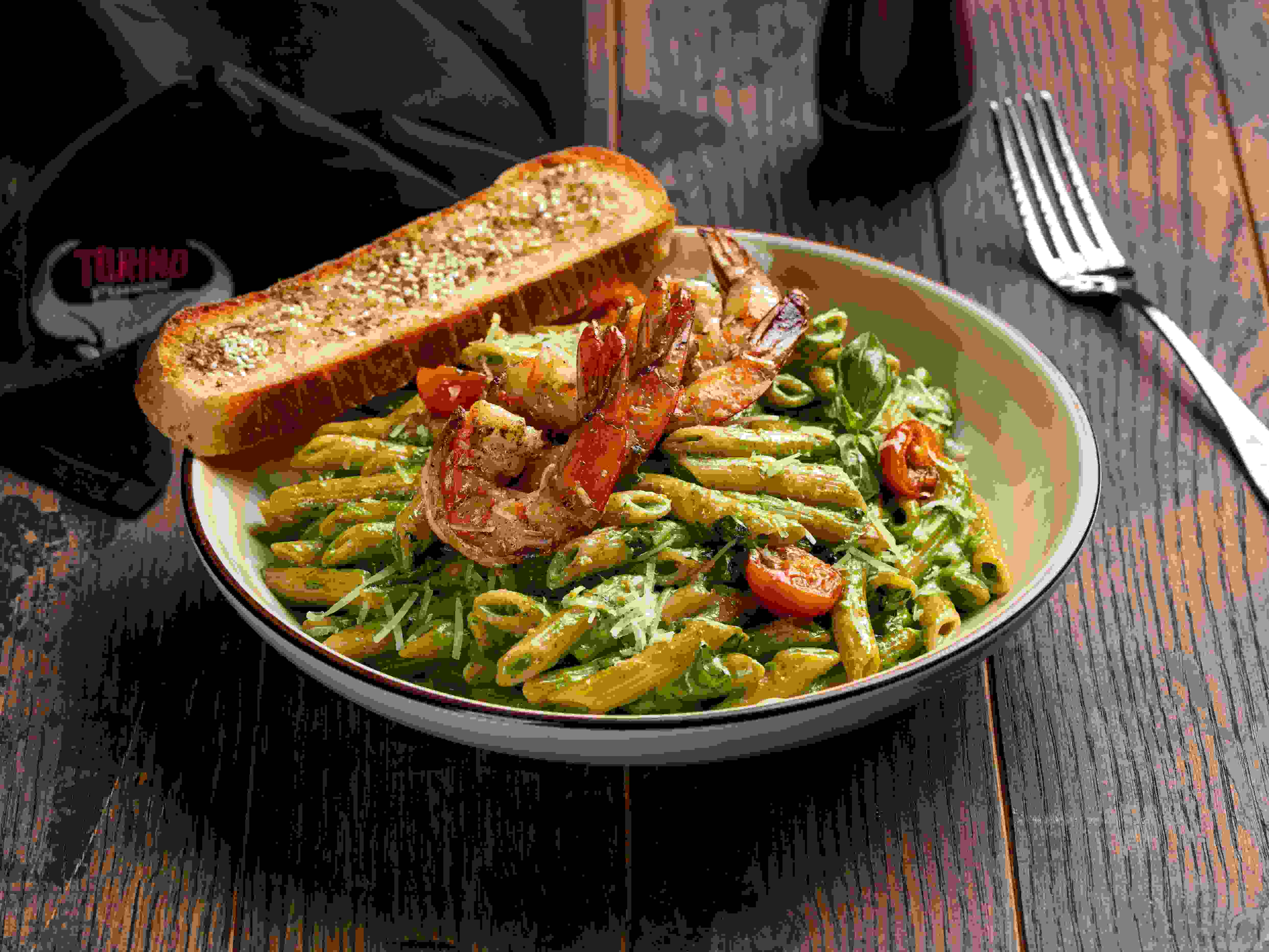 مكرونة بيني ممزوجة بنسختنا الخاصة من صلصة البيستو والصوص الأبيض يعلوها روبيان مشوي طازج وطماطم كرزية حلوة وجبنة بارميزان مع خبز باجيت منزلي الصنع