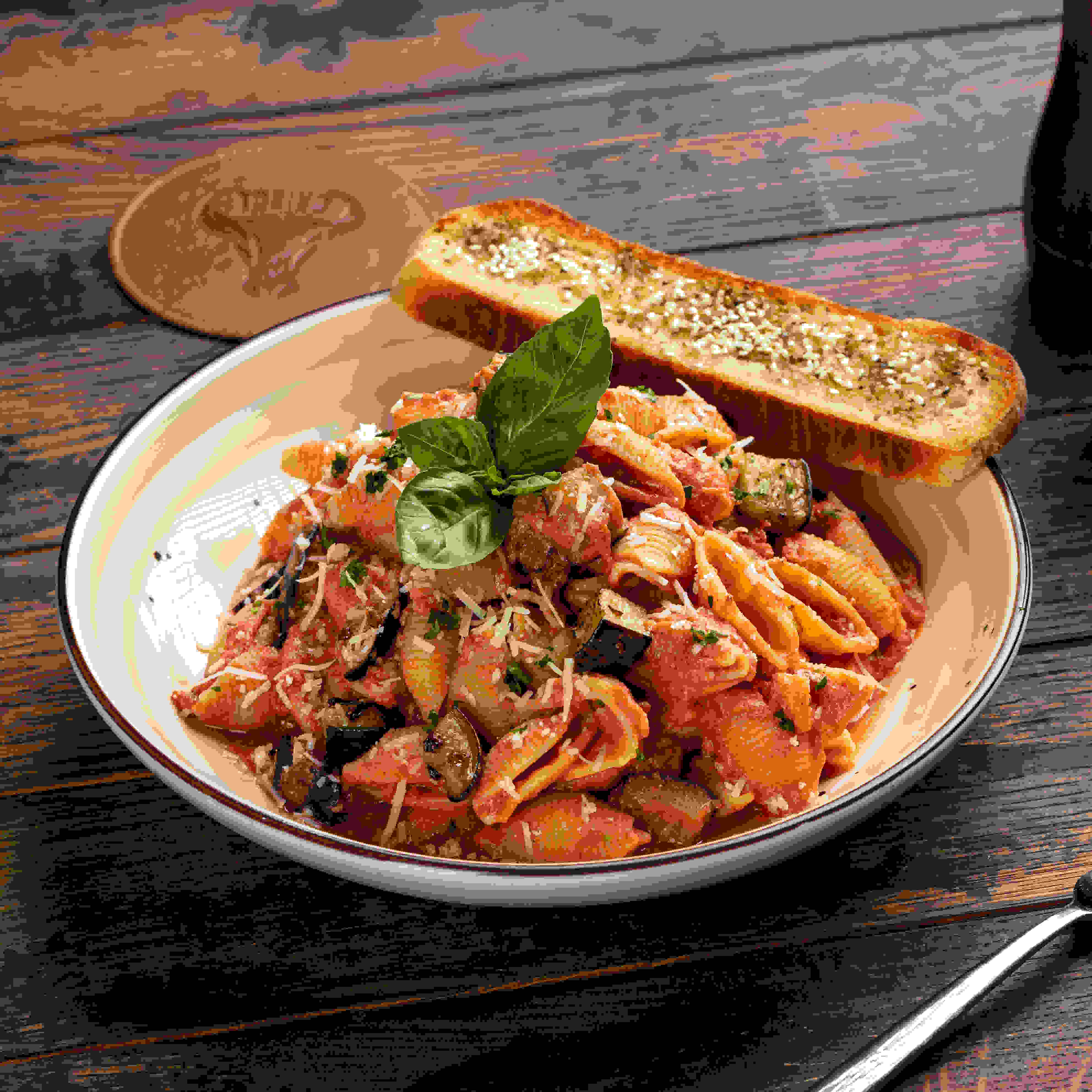 معكرونة جومتي ريغاتي ممزوجة بصلصة بومودورو وجبنة أتيكوتا (جبنة) مغطاة بالباذنجان المقلي العطري وجبنة البارميزان مع جوانب خبز باجيت محلي الصنع