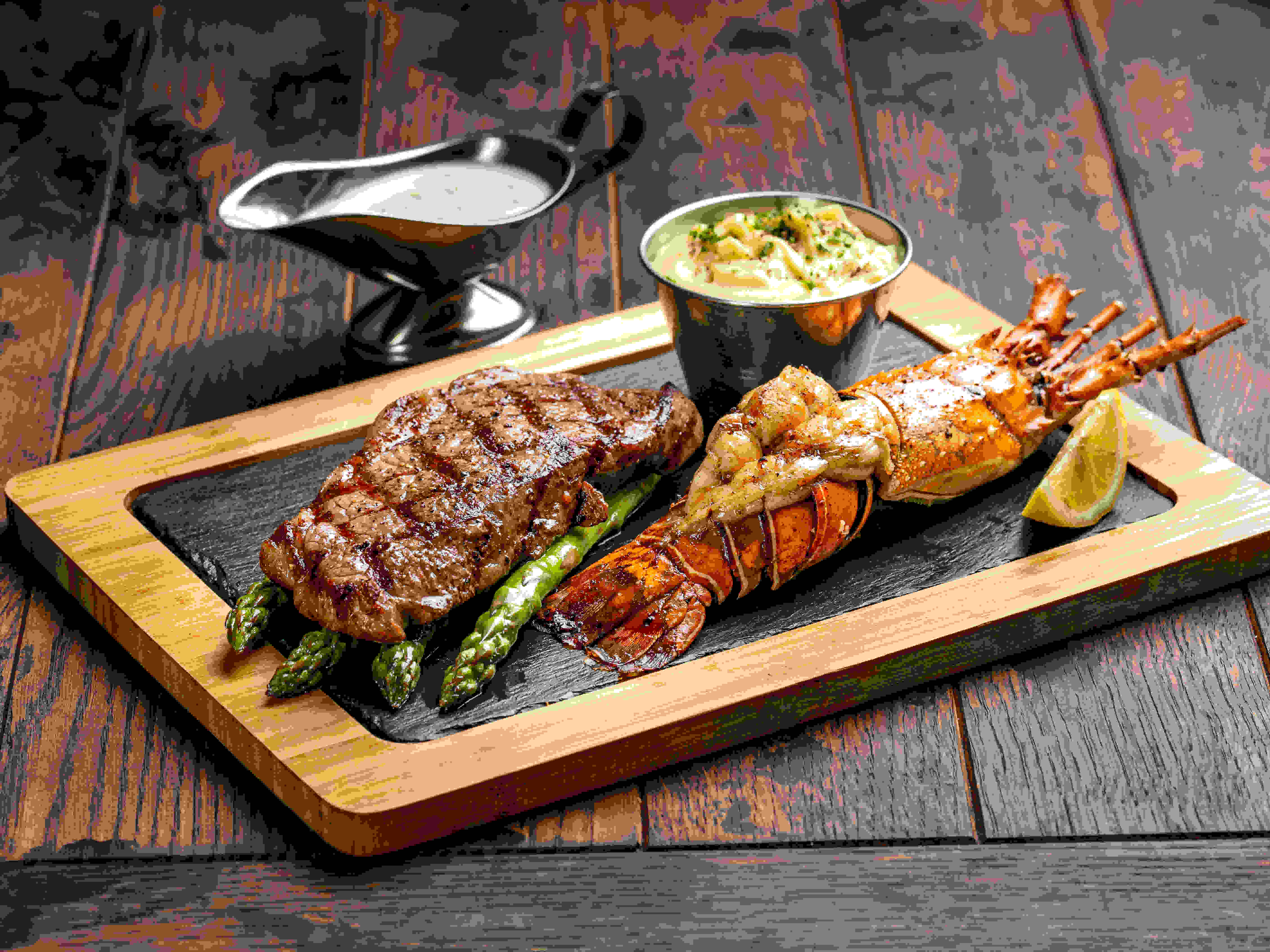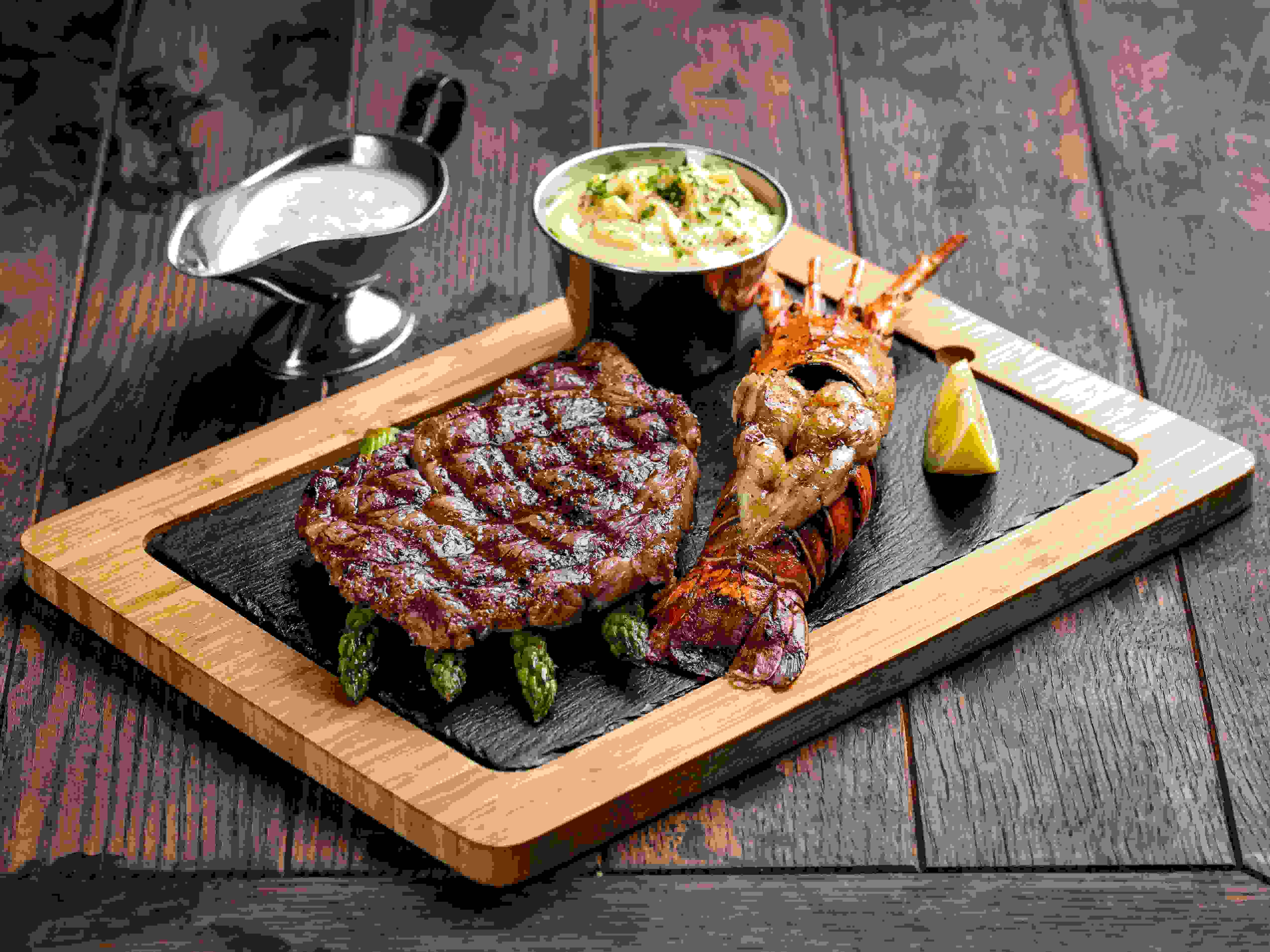 أنجوس ستريبلوين معتمد أمريكيًا ٢٥٠ جرامًا مع الكركند مع طبق جانبي من البطاطس المهروسة الكريمية ومفارش الهليون