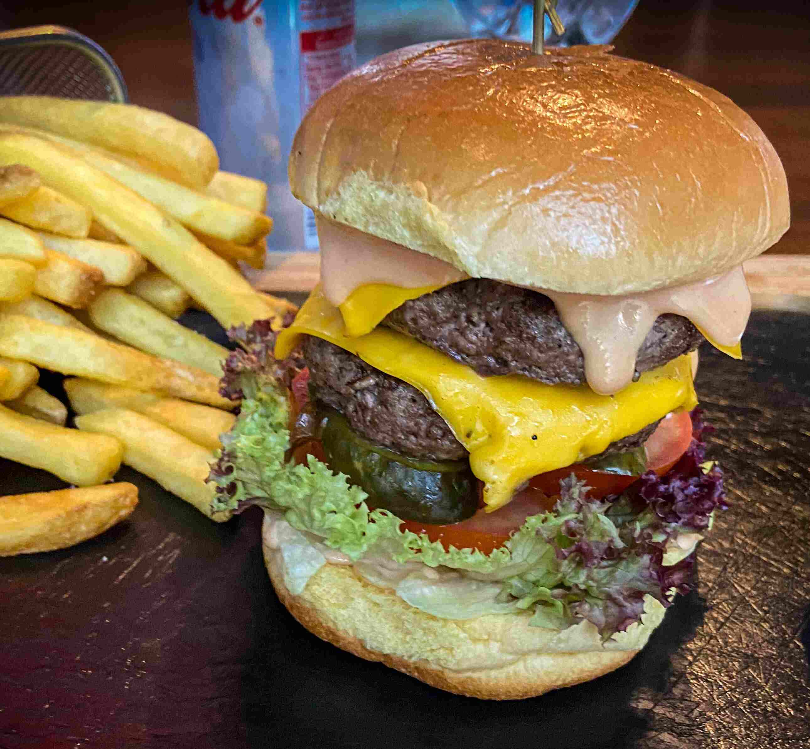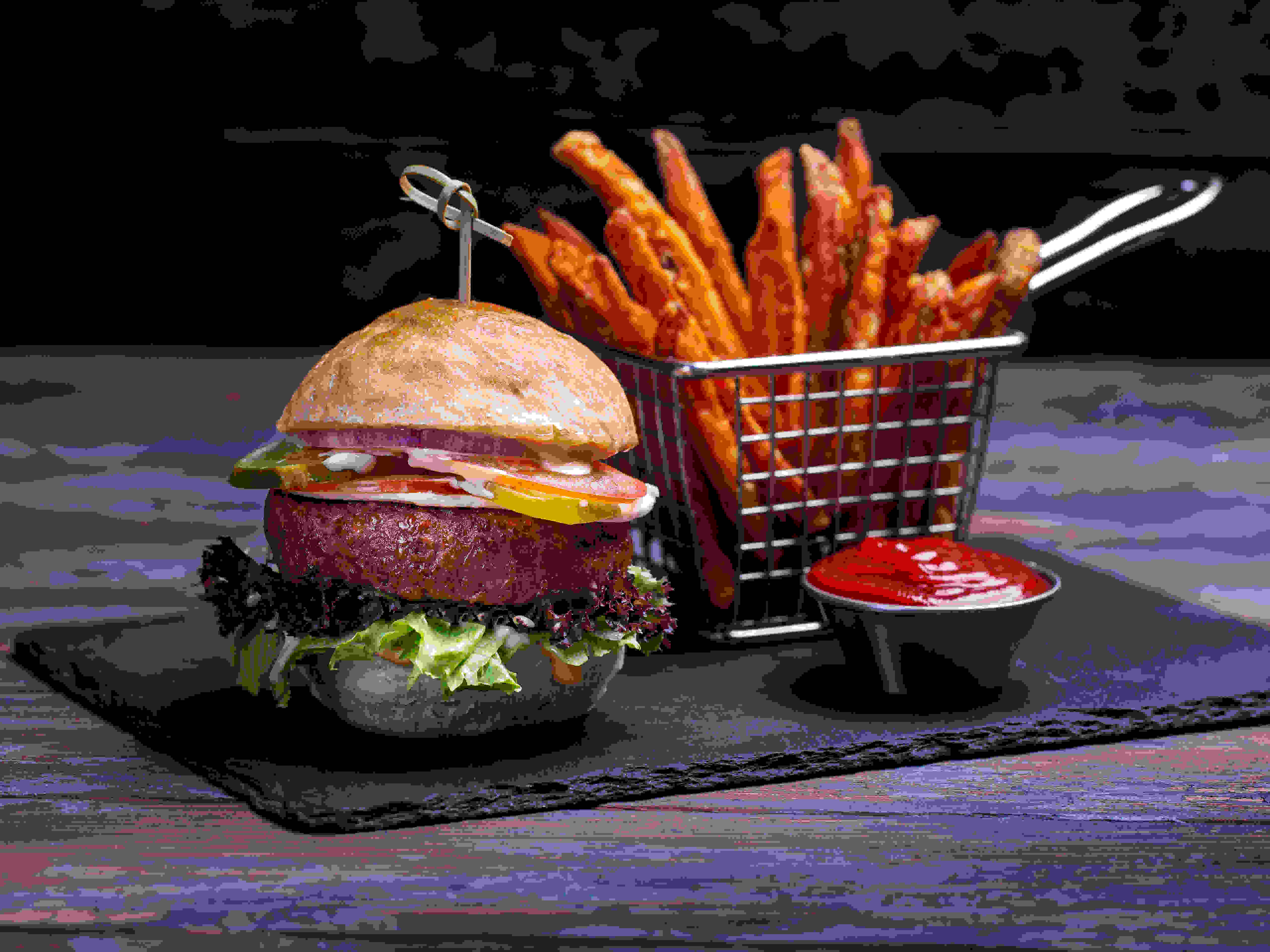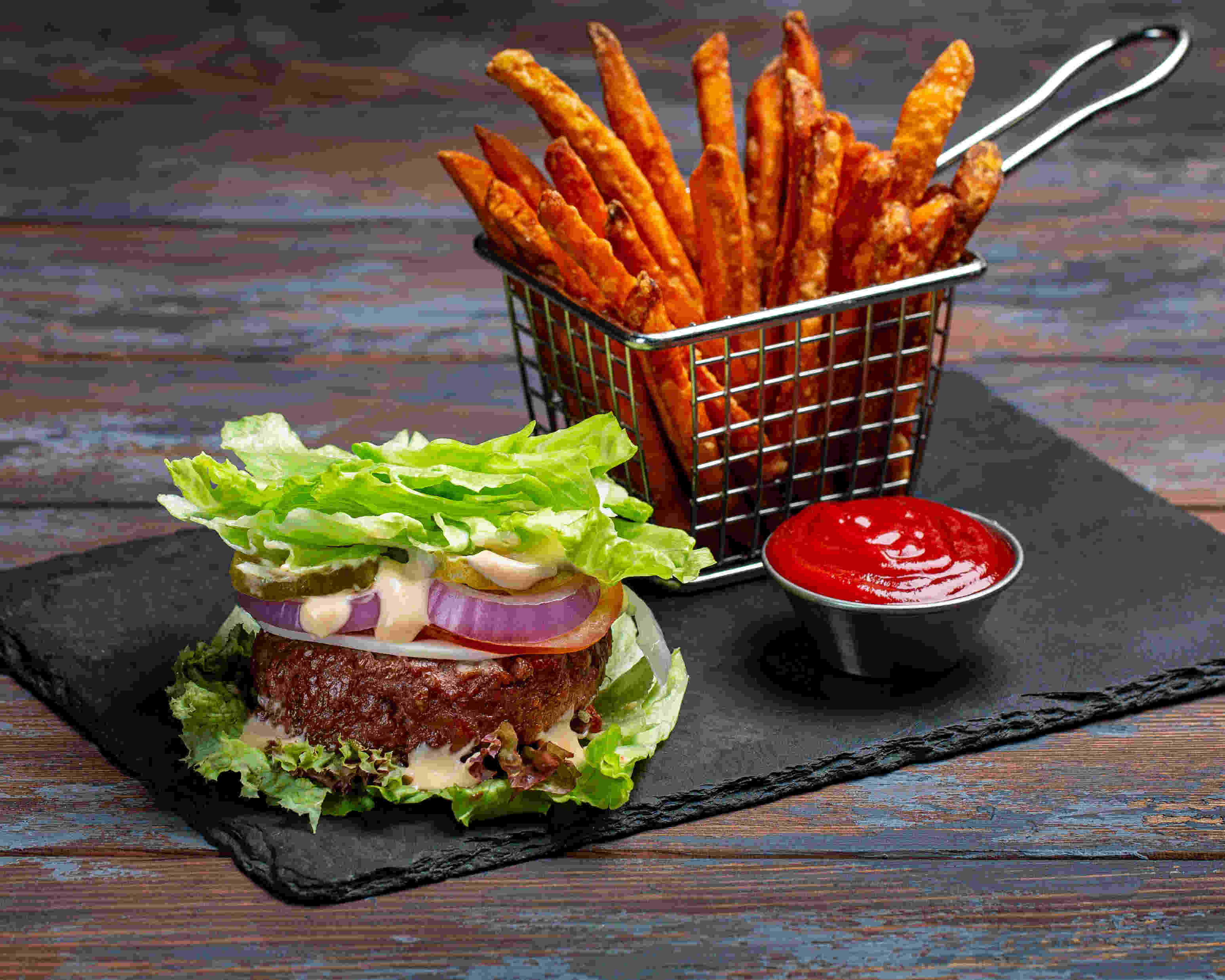 Vegan burger patty topped with fresh plum tomato, red onion, pickled cucumber, crunchy lettuce and homemade vegan burger sauce. Your choice of vegan burger bun or lettuce wrap